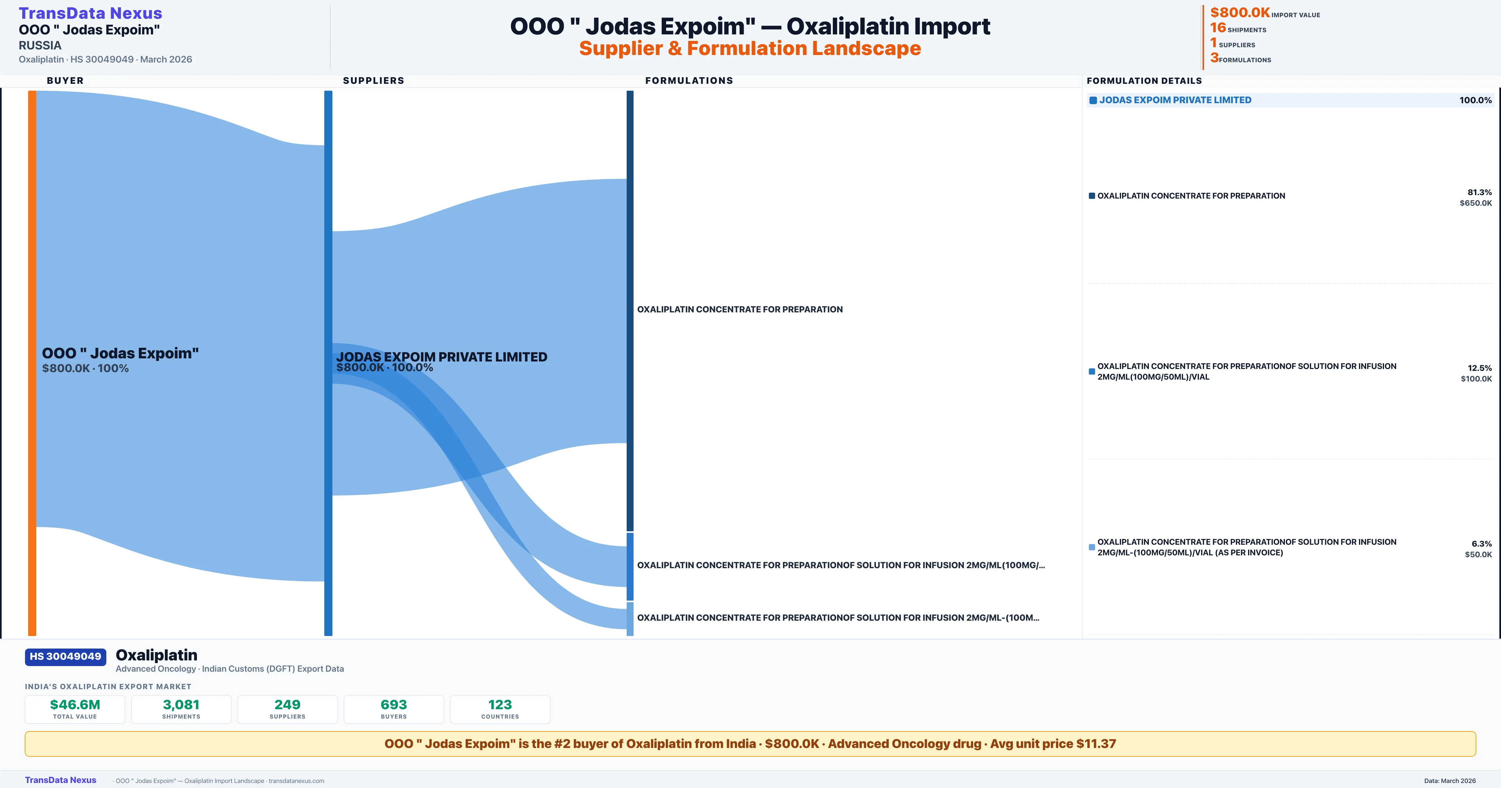 OOO"JODAS EXPOIM" sources Oxaliplatin from 1 verified Indian supplier: JODAS EXPOIM PRIVATE LIMITED ($800.0K, 100.0%). This is based on 16 customs records.