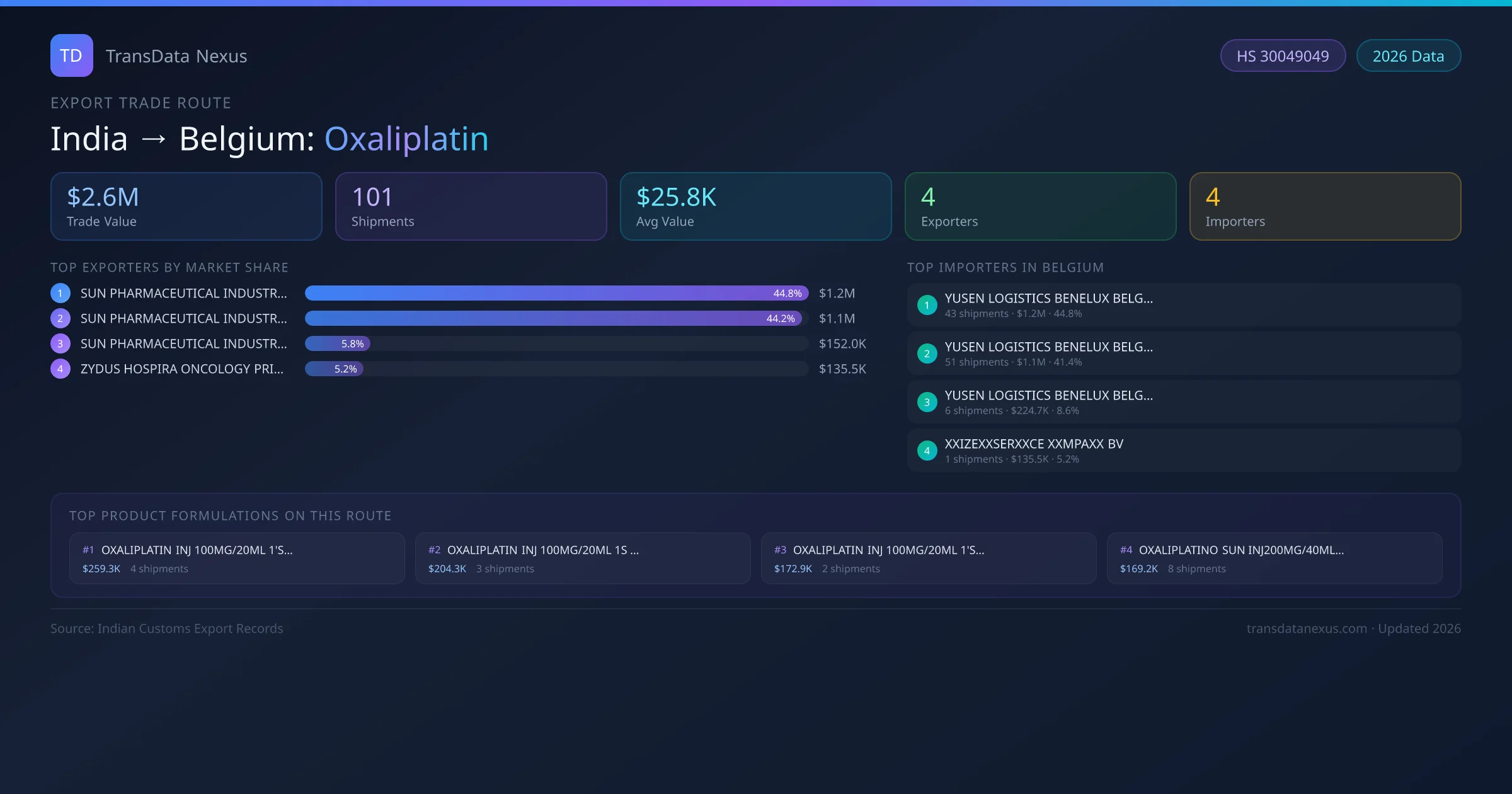 The India to Belgium Oxaliplatin corridor is one of India's established pharmaceutical export routes, with 101 shipments documented worth a combined $2.6M USD. The route is dominated by SUN PHARMACEUTICAL INDUSTRIES LIMITED , which alone accounts for roughly 45% of all export value, reflecting the consolidated nature of India's oxaliplatin manufacturing sector.