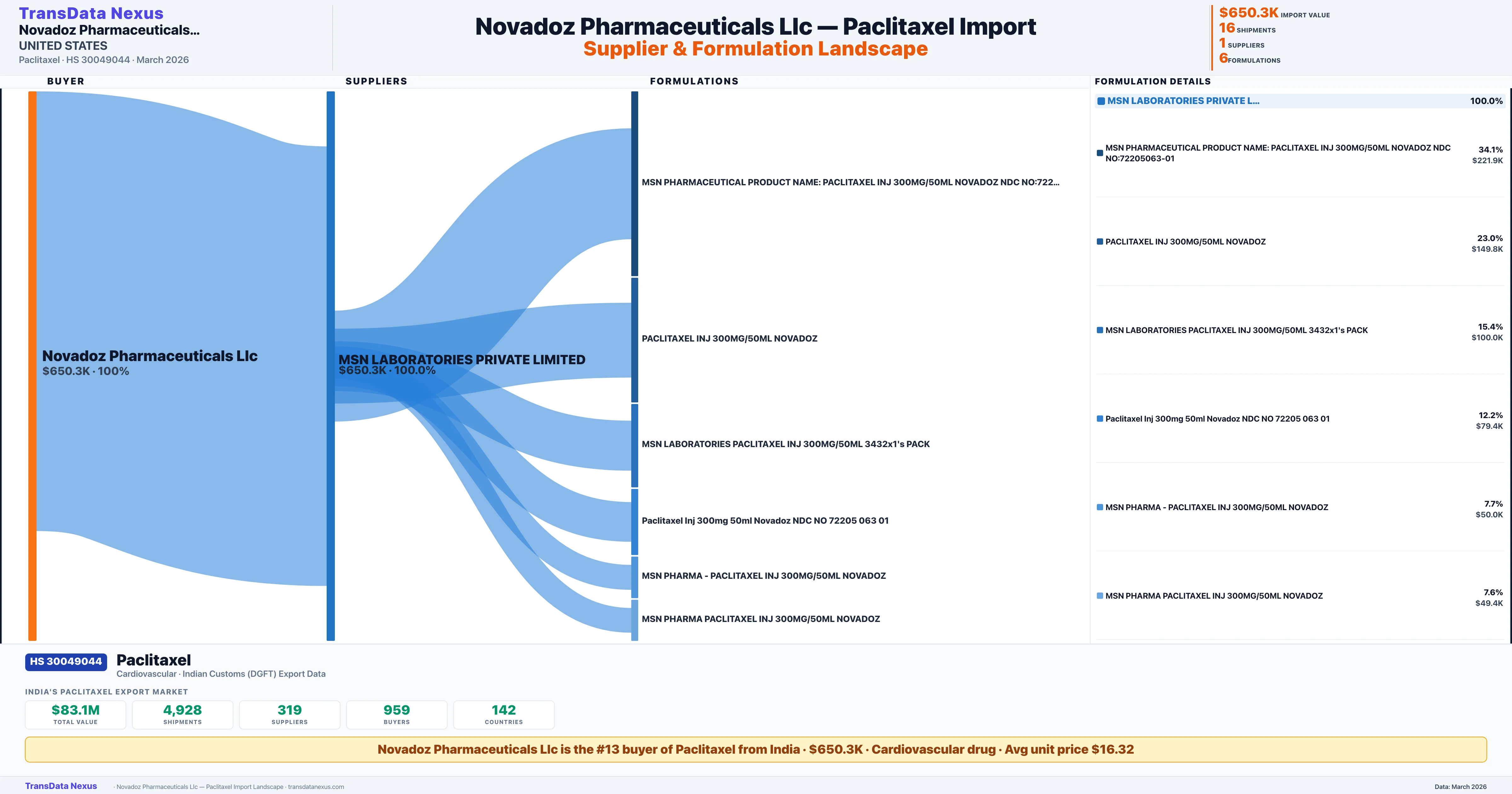 NOVADOZ PHARMACEUTICALS LLC sources Paclitaxel from 1 verified Indian supplier: MSN LABORATORIES PRIVATE LIMITED ($650.3K, 100.0%). This is based on 16 customs records.