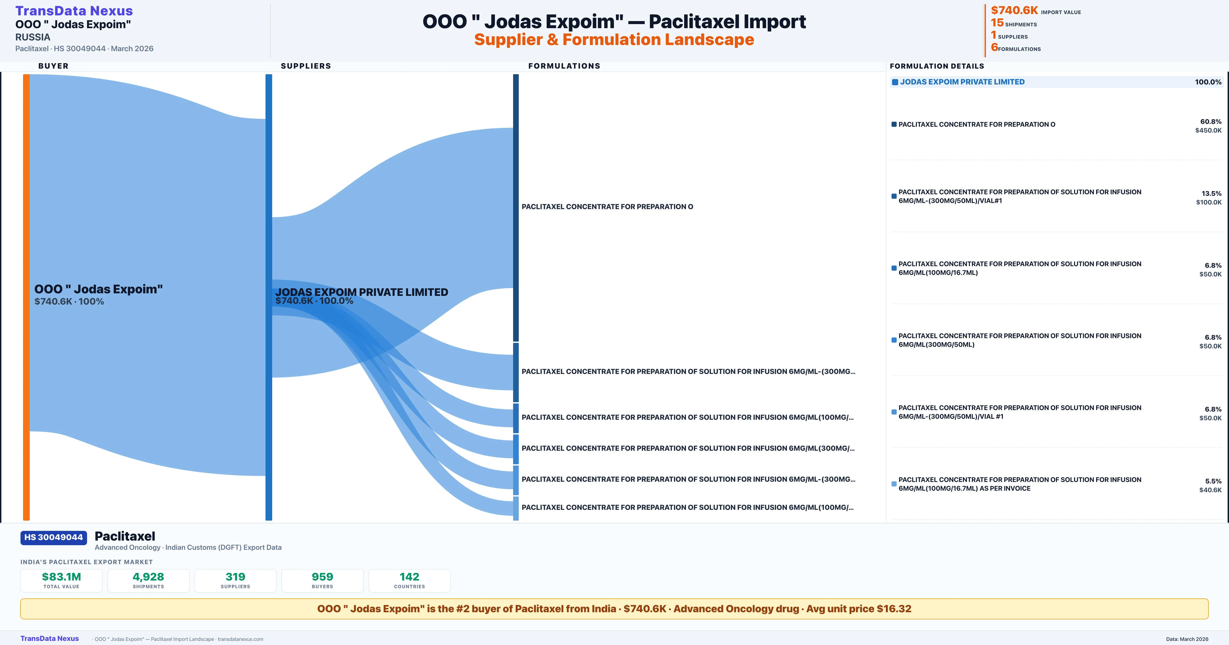 OOO"JODAS EXPOIM" sources Paclitaxel from 1 verified Indian supplier: JODAS EXPOIM PRIVATE LIMITED ($740.6K, 100.0%). This is based on 15 customs records.