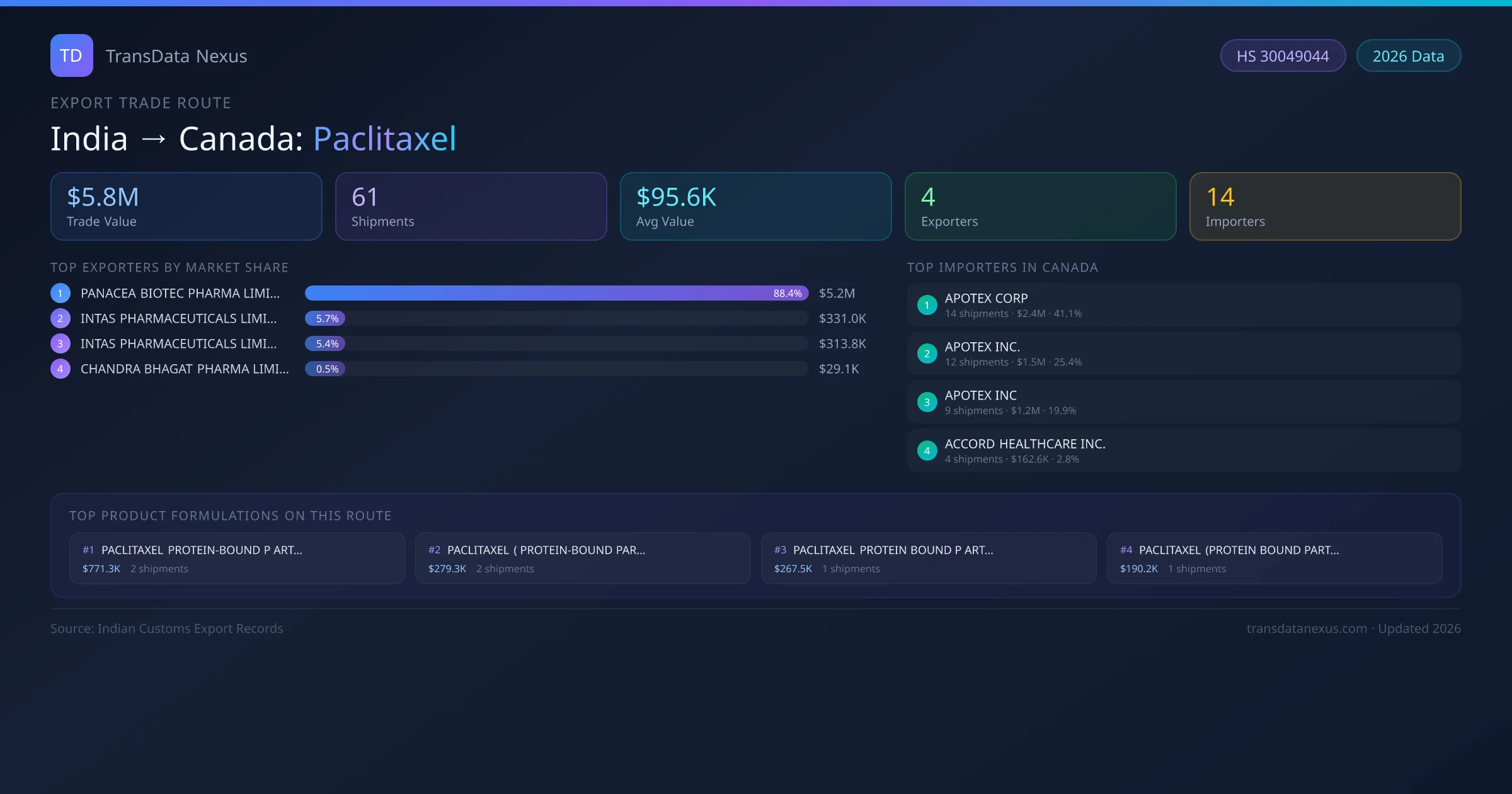 India exports Paclitaxel to Canada worth approximately $5.8M USD across 61 recorded shipments. The average value per shipment is $95.6K USD.
