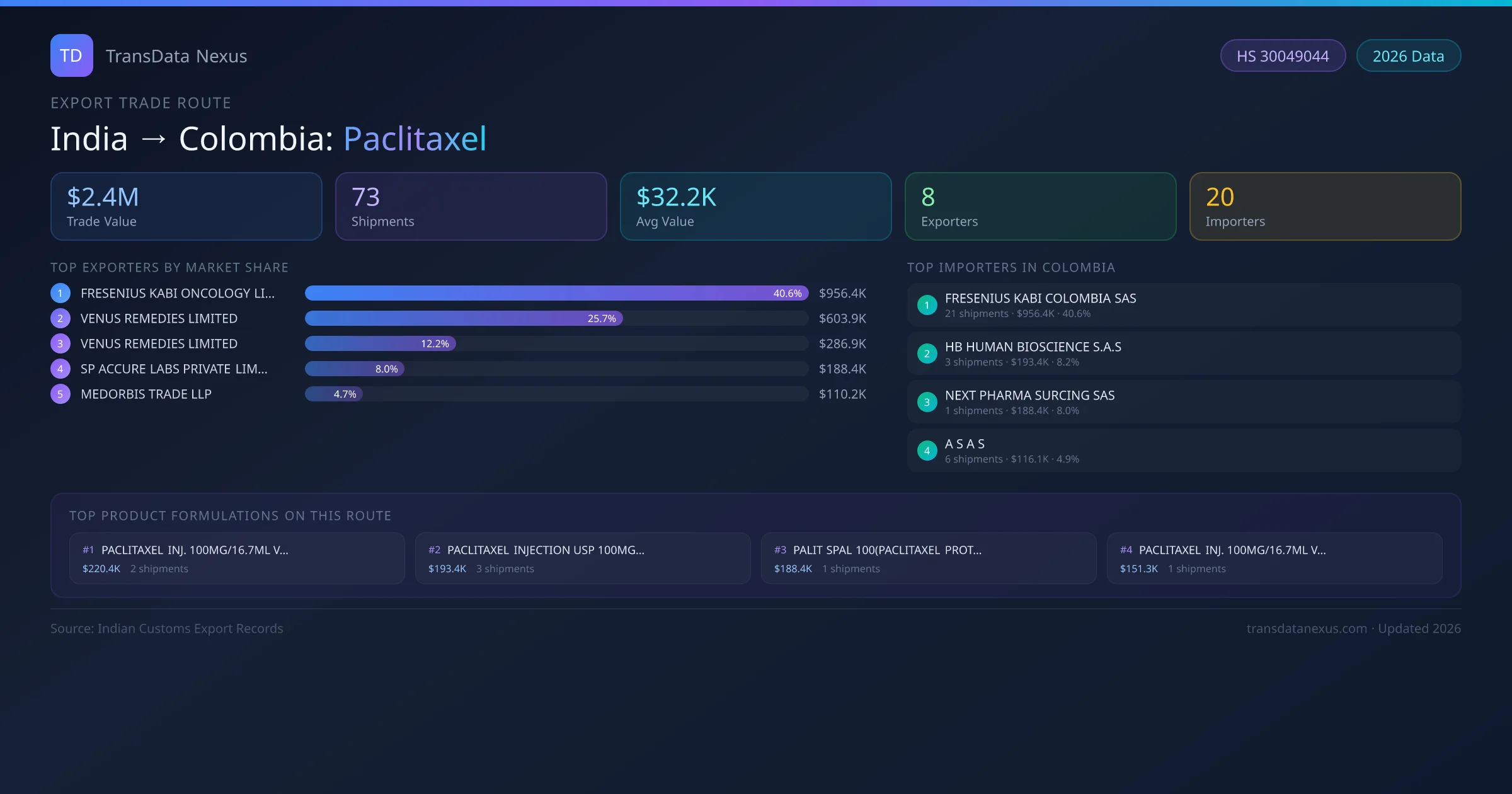 The India to Colombia Paclitaxel corridor is one of India's established pharmaceutical export routes, with 73 shipments documented worth a combined $2.4M USD. The route is dominated by FRESENIUS KABI ONCOLOGY LIMITED, which alone accounts for roughly 41% of all export value, reflecting the consolidated nature of India's paclitaxel manufacturing sector.
