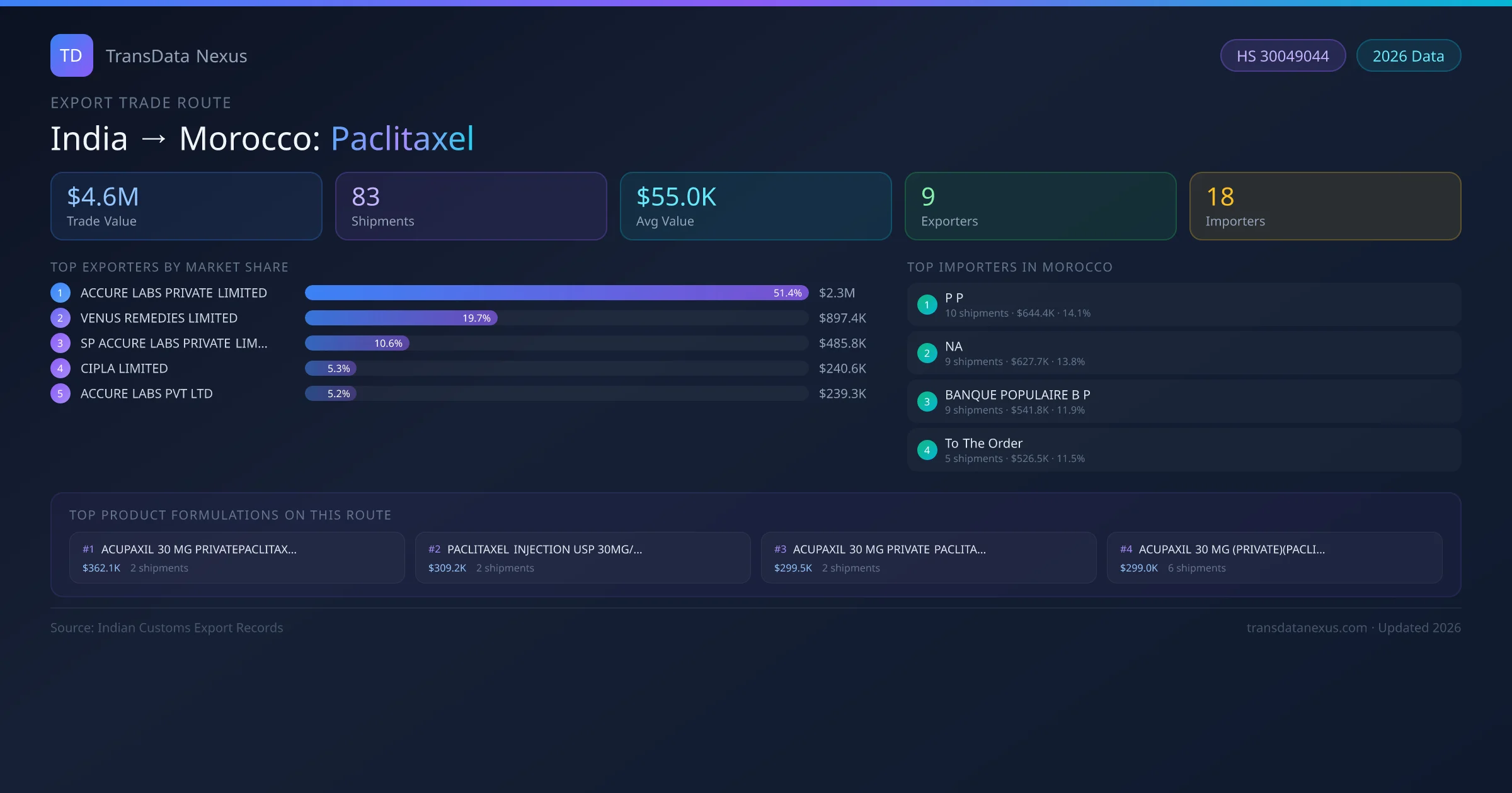 The India to Morocco Paclitaxel corridor is one of India's established pharmaceutical export routes, with 83 shipments documented worth a combined $4.6M USD. The route is dominated by ACCURE LABS PRIVATE LIMITED, which alone accounts for roughly 51% of all export value, reflecting the consolidated nature of India's paclitaxel manufacturing sector.