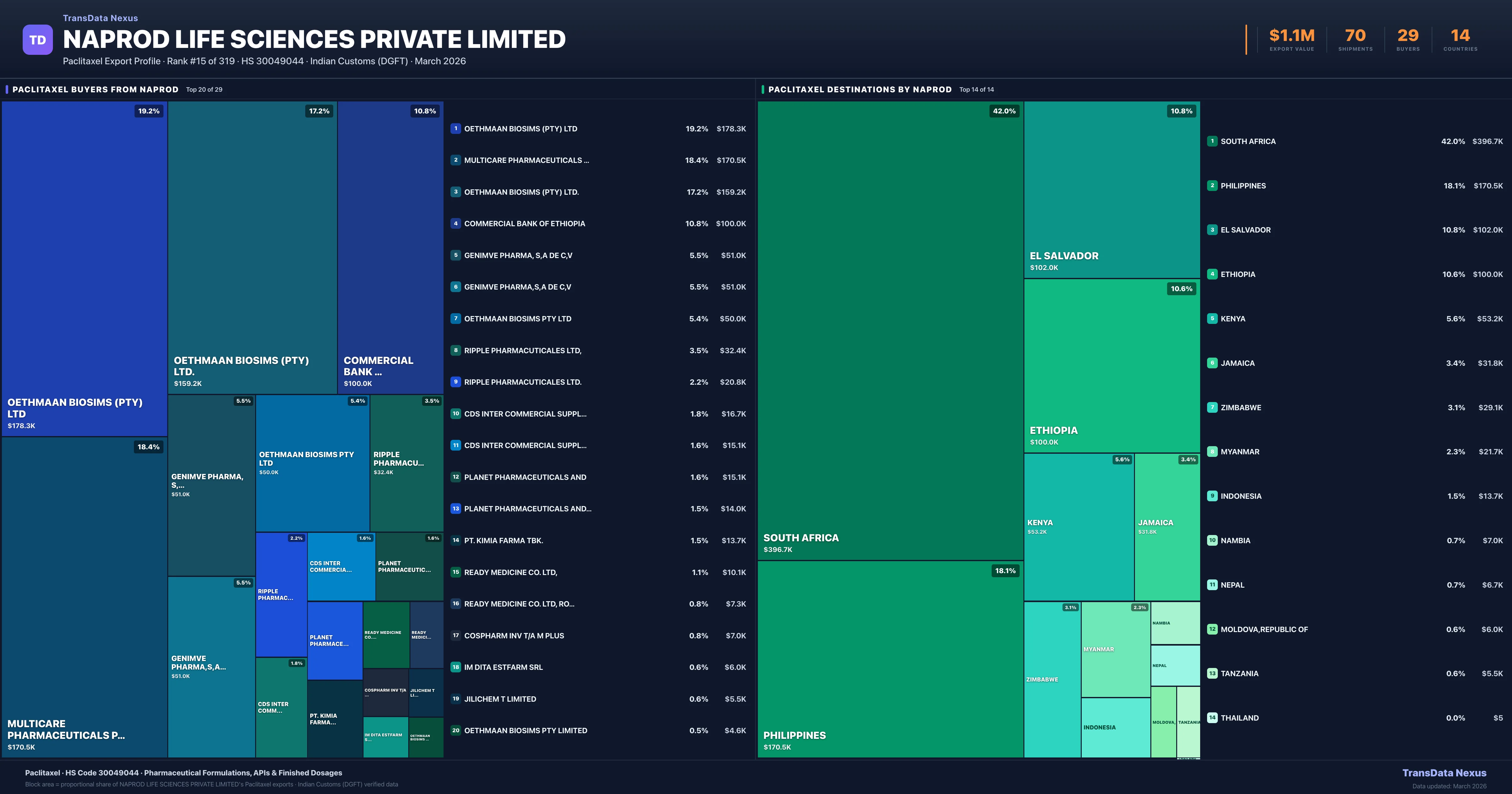 Naprod Life Sciences Private Limited supplies Paclitaxel to 29 buyers globally. The largest buyer is OETHMAAN BIOSIMS (PTY) LTD (SOUTH AFRICA), followed by MULTICARE PHARMACEUTICALS PHILIPPIN (PHILIPPINES) and OETHMAAN BIOSIMS (PTY) LTD. (SOUTH AFRICA). These buyers represent pharmaceutical distributors, hospital groups, and government procurement agencies in their respective markets.