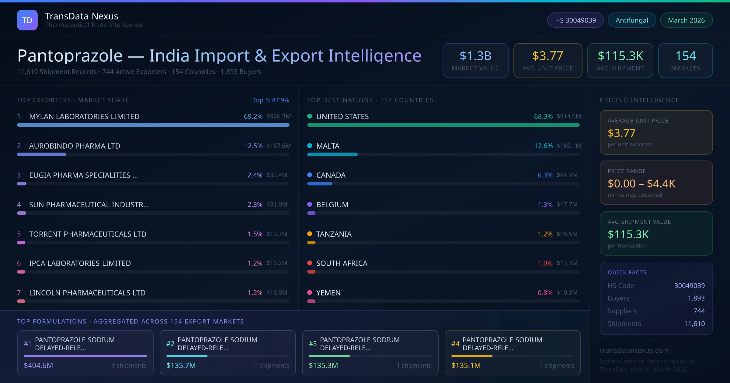 Between 2022 and 2026, India exported $1.3B worth of pantoprazole across 11,610 verified shipments to 154 countries — covering 79% of world markets in the Gastrointestinal segment. The largest destination is UNITED STATES (68.3%). MYLAN LABORATORIES LIMITED leads with a 69.2% share. All figures are drawn from Indian Customs (DGFT) shipping bill records spanning four years of trade activity.