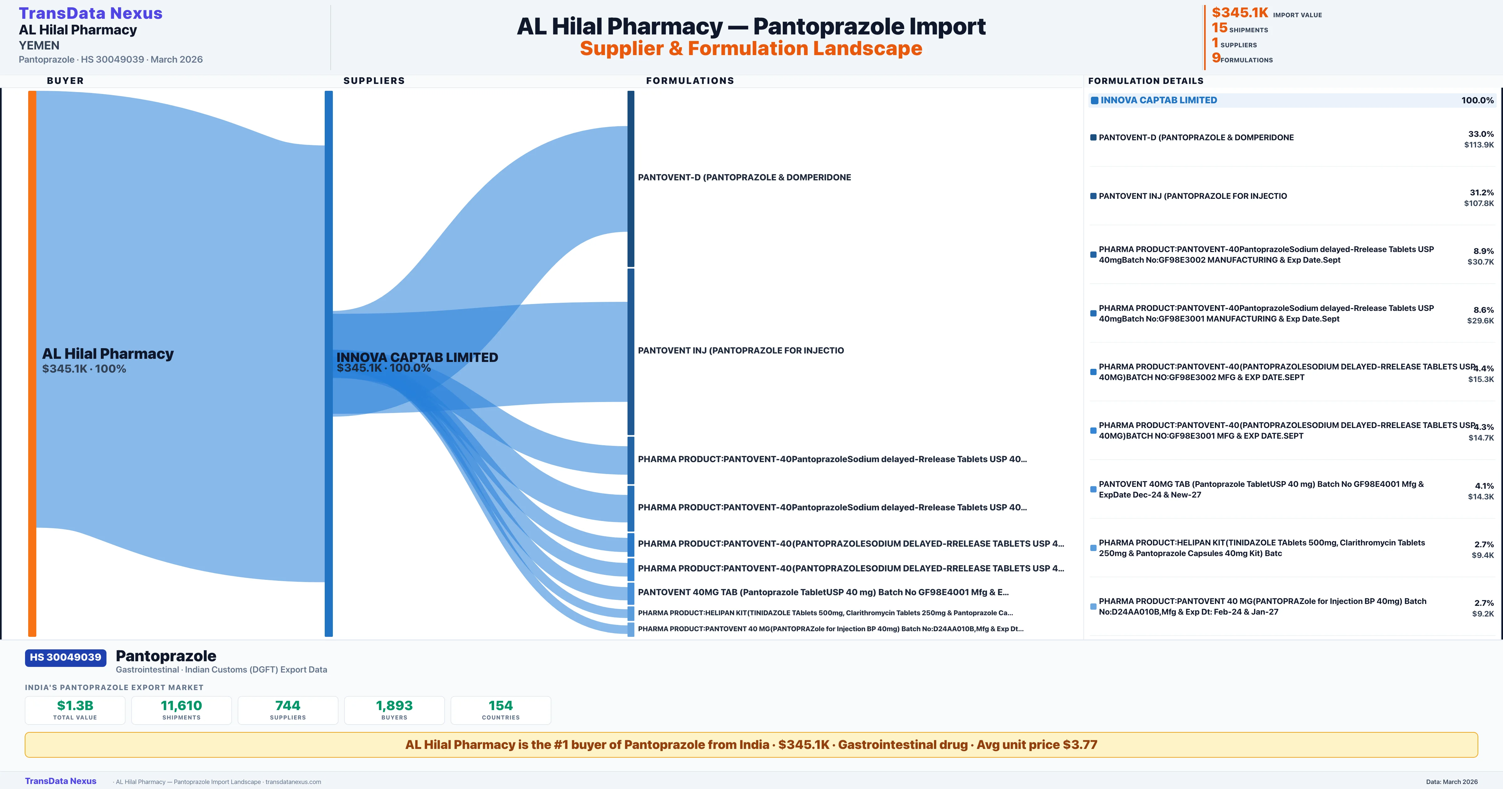 Access order-level details, pricing data, supplier connections, and competitive analysis for AL HILAL PHARMACY's Pantoprazole imports. TransData Nexus provides verified Indian Customs (DGFT) data trusted by pharmaceutical trade professionals worldwide.