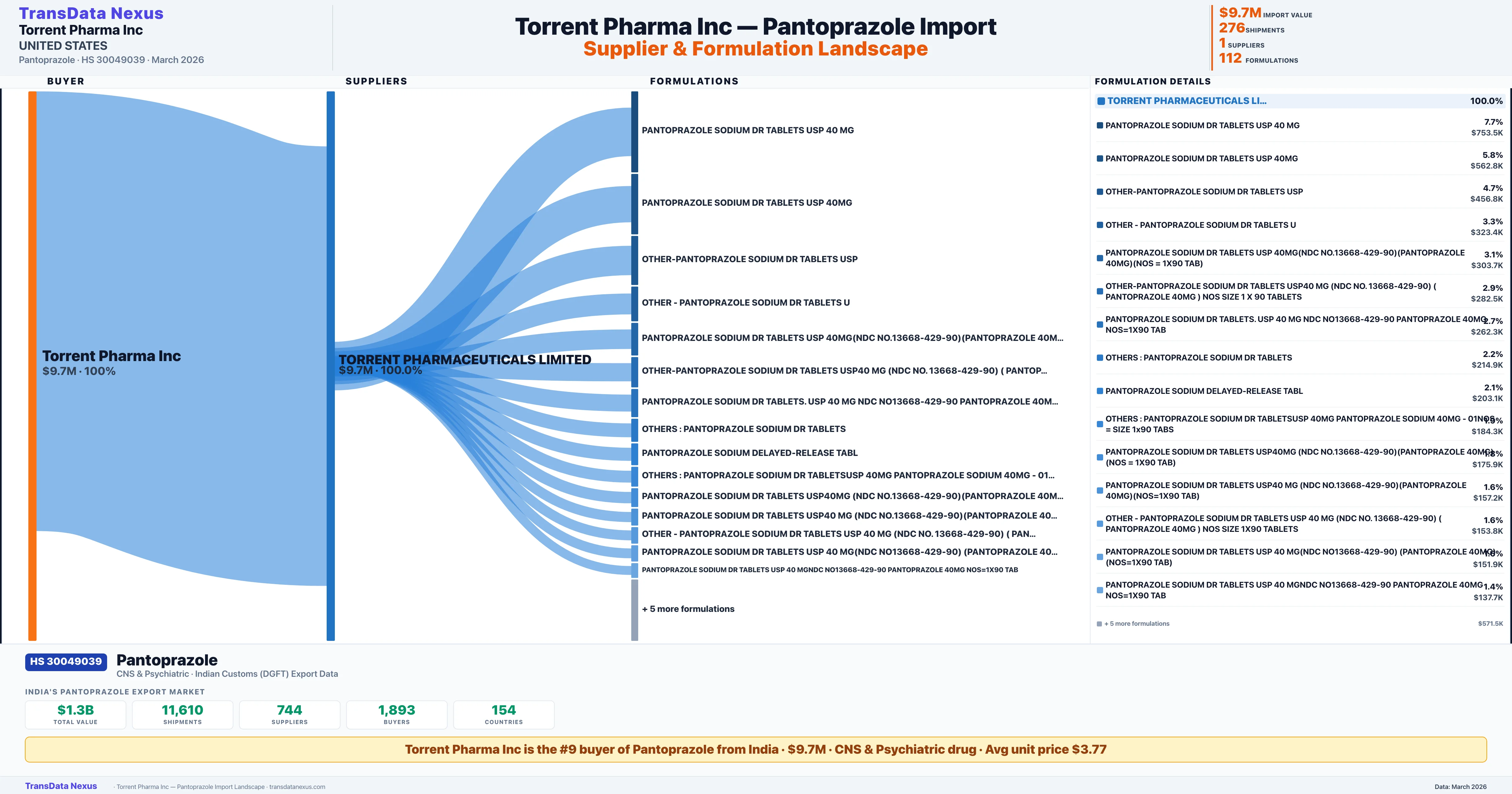 TORRENT PHARMA INC sources Pantoprazole from 1 verified Indian supplier: TORRENT PHARMACEUTICALS LIMITED ($9.7M, 100.0%). This is based on 276 customs records.