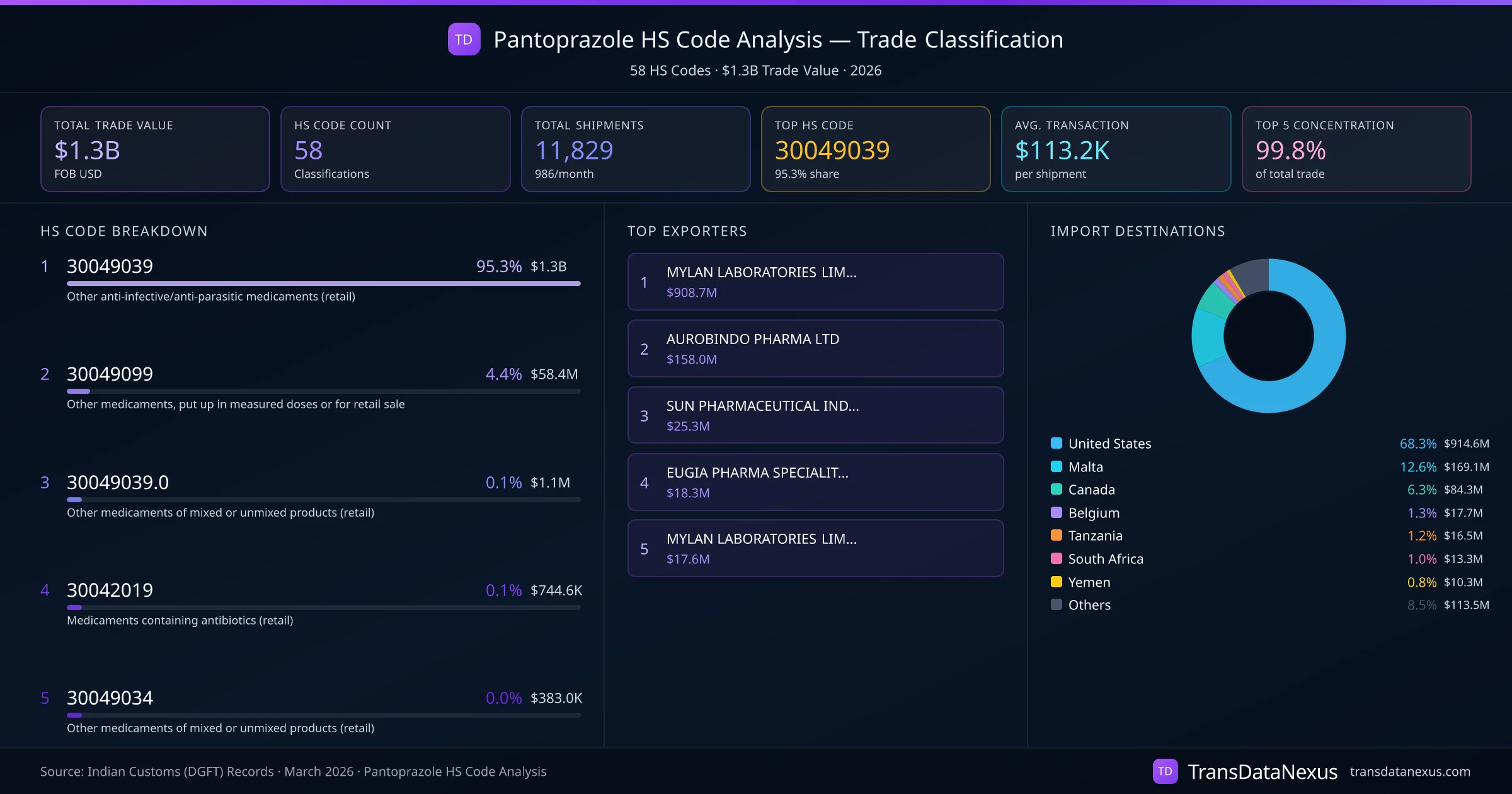 India exports Pantoprazole under 58 distinct HS code classifications, representing a total trade value of $1.3B across 11,829 shipments. The dominant classification is HS 30049039 (Other anti-infective/anti-parasitic medicaments (retail)), accounting for 95.3% of all Pantoprazole trade at $1.3B. HS 30049099 (Other medicaments, put up in measured doses or for retail sale) follows at 4.4% ($58.4M). The top 5 HS codes together account for 99.8% of total Pantoprazole trade from India. The average transaction value is $113230. Key importing markets include United States, Malta, Canada. Leading exporters include MYLAN LABORATORIES LIMITED and AUROBINDO PHARMA LTD. Data sourced from Indian Customs (DGFT) shipping bill records.