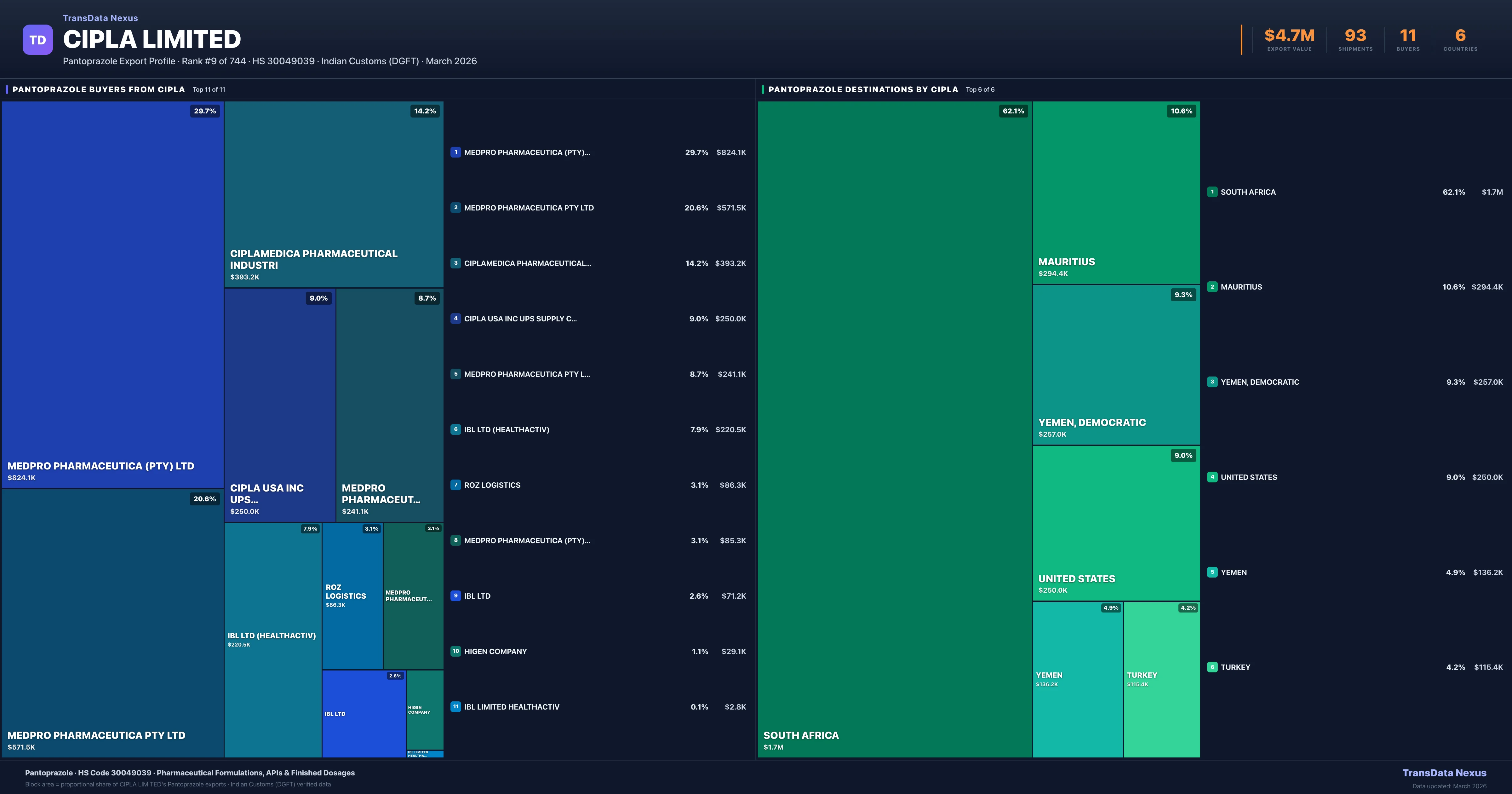 Access shipment-level details, pricing data, buyer connections, and competitive analysis for Cipla Limited's Pantoprazole exports. TransData Nexus provides verified Indian Customs (DGFT) data trusted by pharmaceutical trade professionals worldwide.