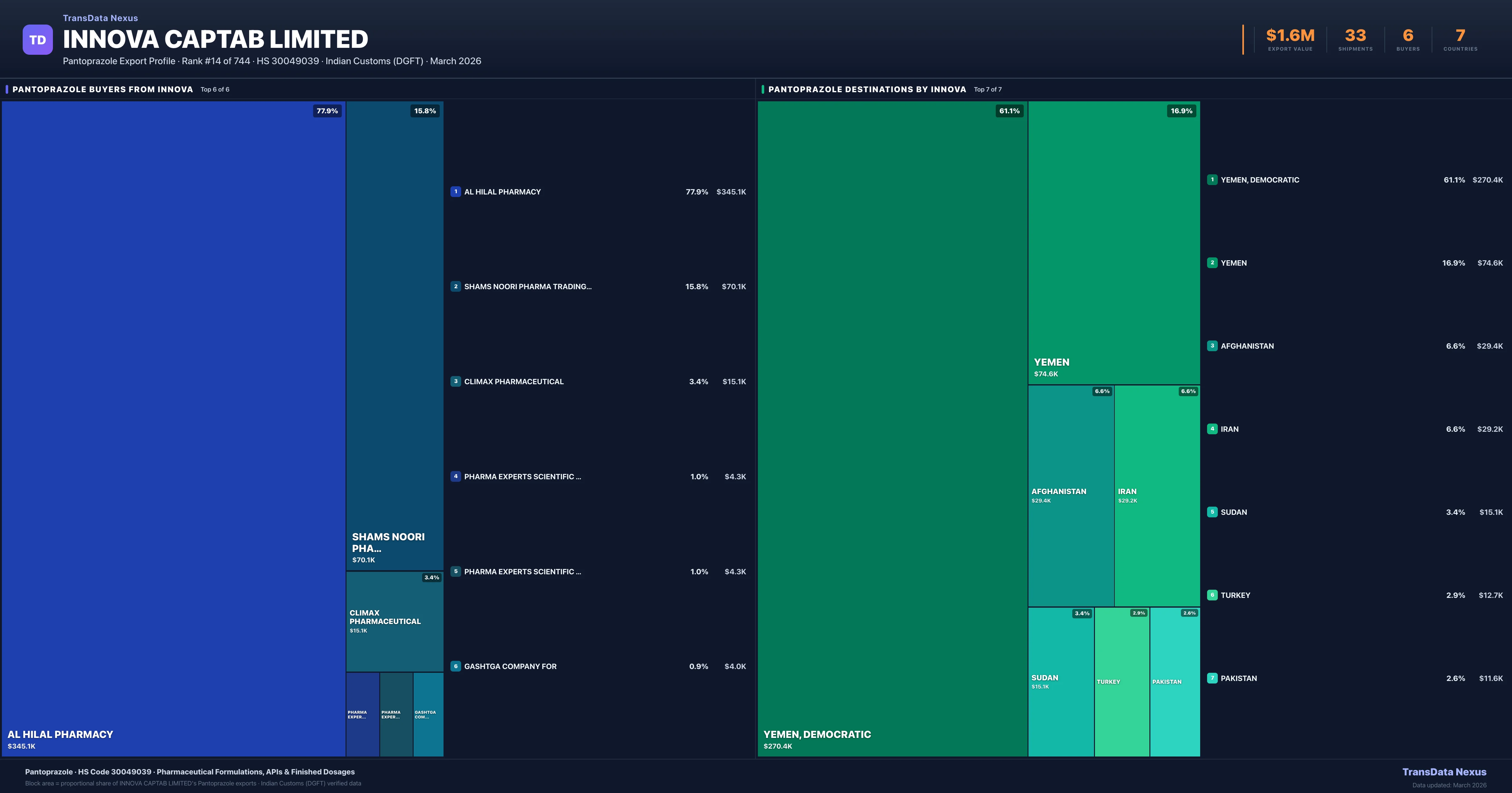Innova Captab Limited supplies Pantoprazole to 6 buyers globally. The largest buyer is AL HILAL PHARMACY (YEMEN, DEMOCRATIC), followed by SHAMS NOORI PHARMA TRADING COMPANY (PAKISTAN) and CLIMAX PHARMACEUTICAL (SUDAN). These buyers represent pharmaceutical distributors, hospital groups, and government procurement agencies in their respective markets.