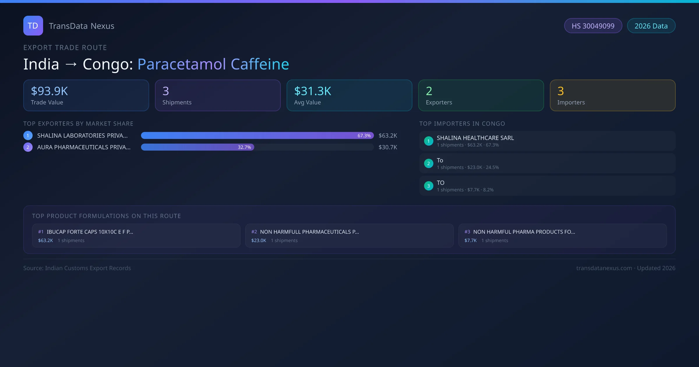 The India to Congo Paracetamol Caffeine corridor is one of India's established pharmaceutical export routes, with 3 shipments documented worth a combined $93.9K USD. The route is dominated by SHALINA LABORATORIES PRIVATE LIMITED, which alone accounts for roughly 67% of all export value, reflecting the consolidated nature of India's paracetamol caffeine manufacturing sector.