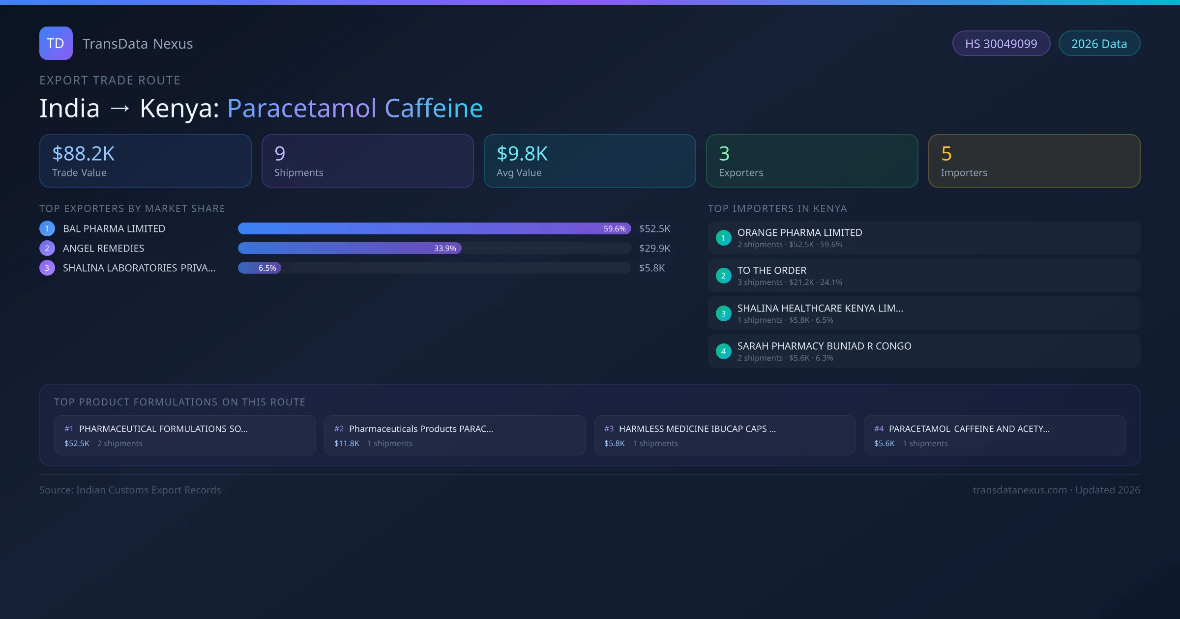- 1.Route Identification: India to Kenya export trade corridor identified from Indian Customs (DGFT) records for Paracetamol Caffeine.