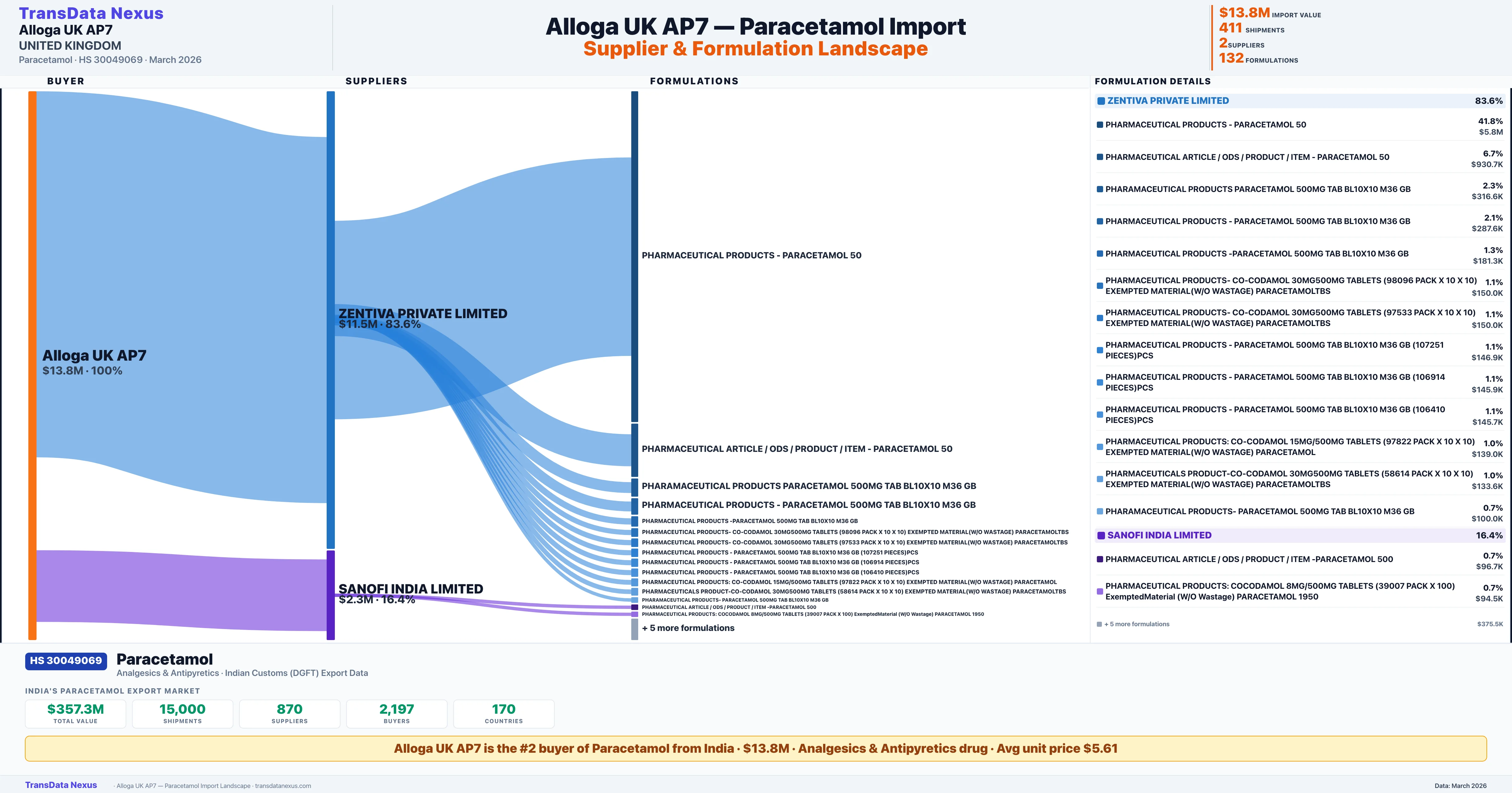 ALLOGA UK AP7 sources Paracetamol from 2 verified Indian suppliers: ZENTIVA PRIVATE LIMITED ($11.5M, 83.6%), SANOFI INDIA LIMITED ($2.3M, 16.4%). This is based on 411 customs records.