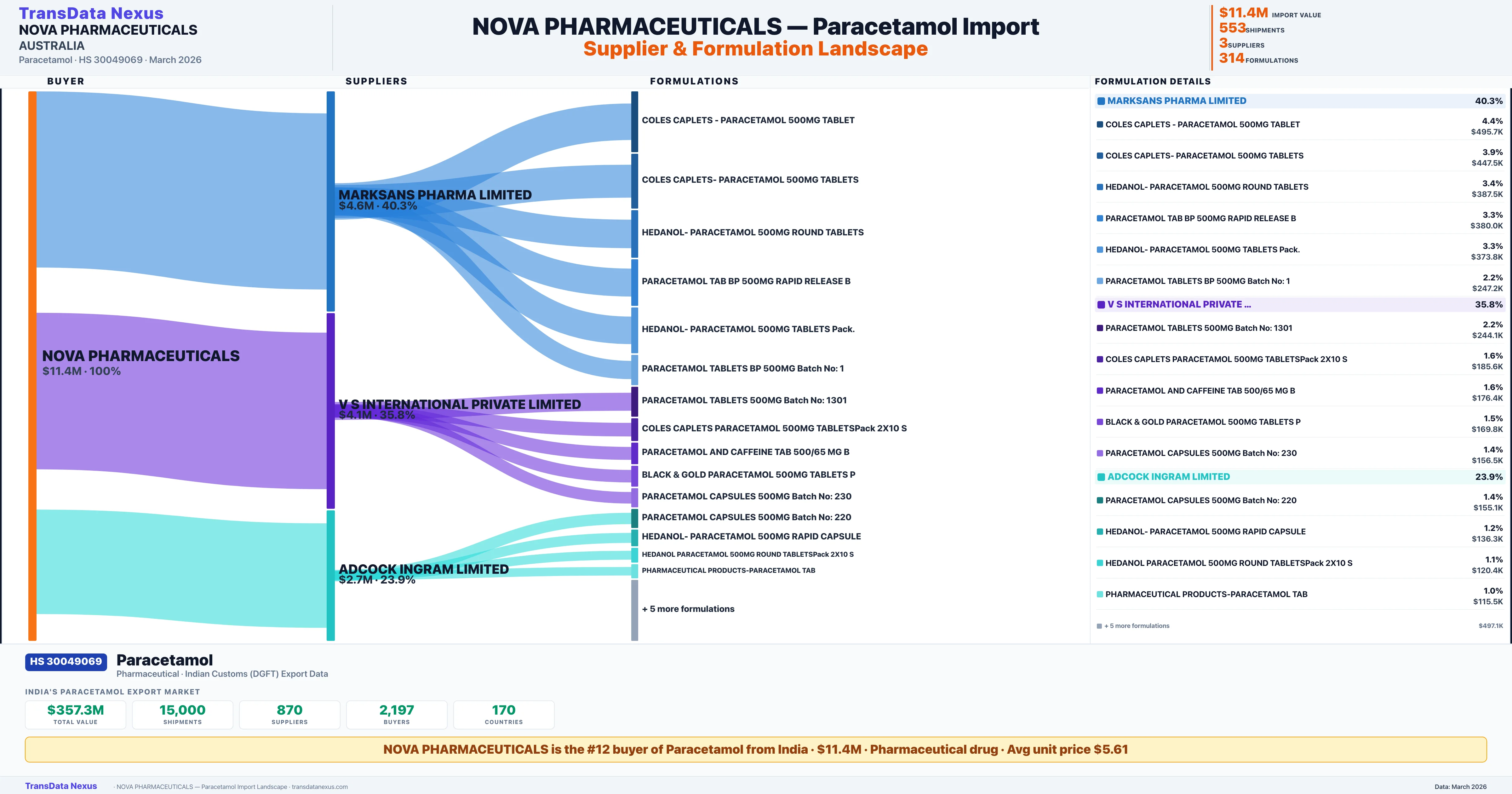 NOVA PHARMACEUTICALS sources Paracetamol from 3 verified Indian suppliers: MARKSANS PHARMA LIMITED ($4.6M, 40.3%), V S INTERNATIONAL PRIVATE LIMITED ($4.1M, 35.8%), ADCOCK INGRAM LIMITED ($2.7M, 23.9%). This is based on 553 customs records.