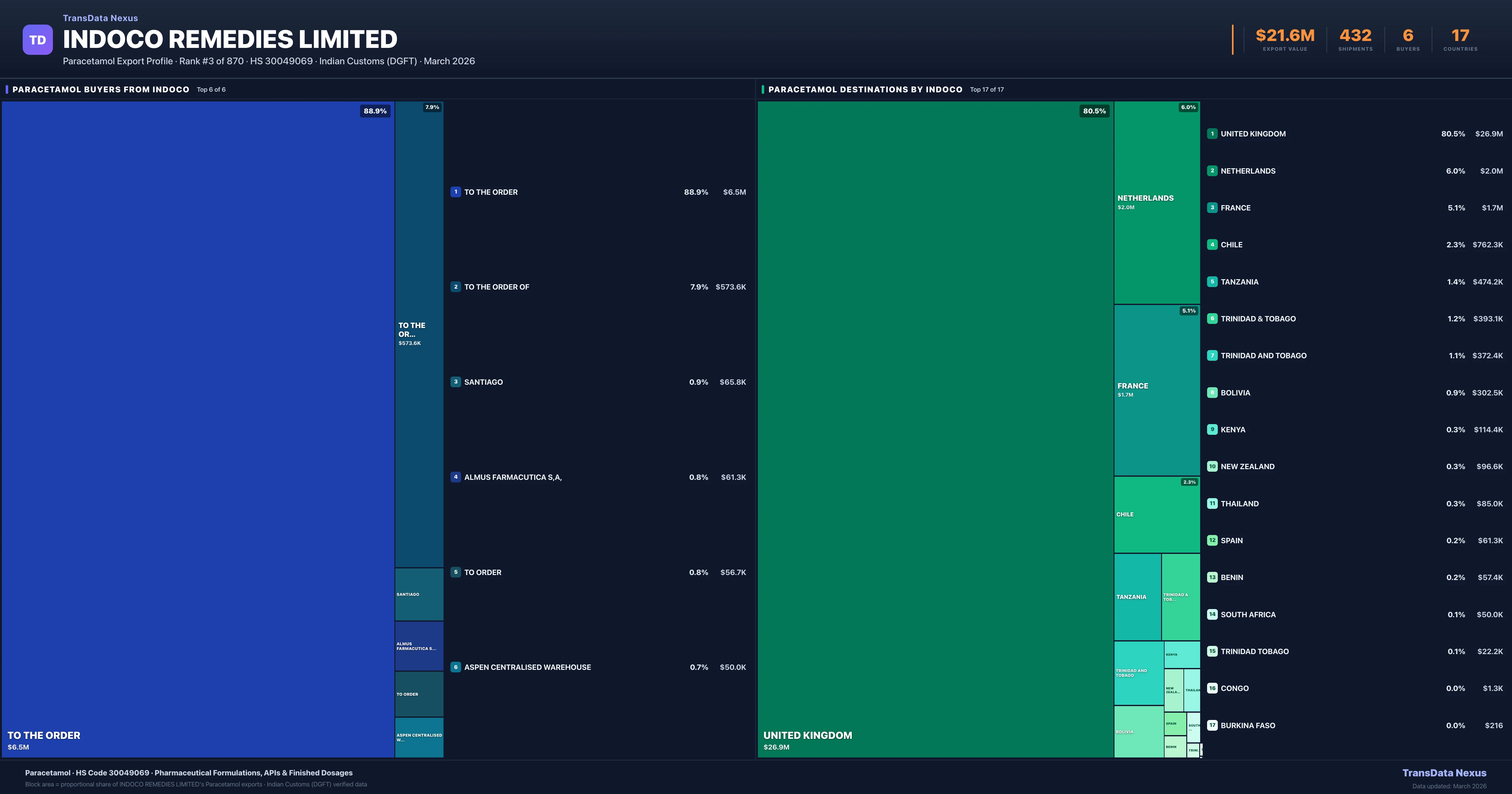 Indoco Remedies Limited supplies Paracetamol to 6 buyers globally. The largest buyer is TO THE ORDER (FRANCE), followed by TO THE ORDER OF (NETHERLANDS) and SANTIAGO (CHILE). These buyers represent pharmaceutical distributors, hospital groups, and government procurement agencies in their respective markets.