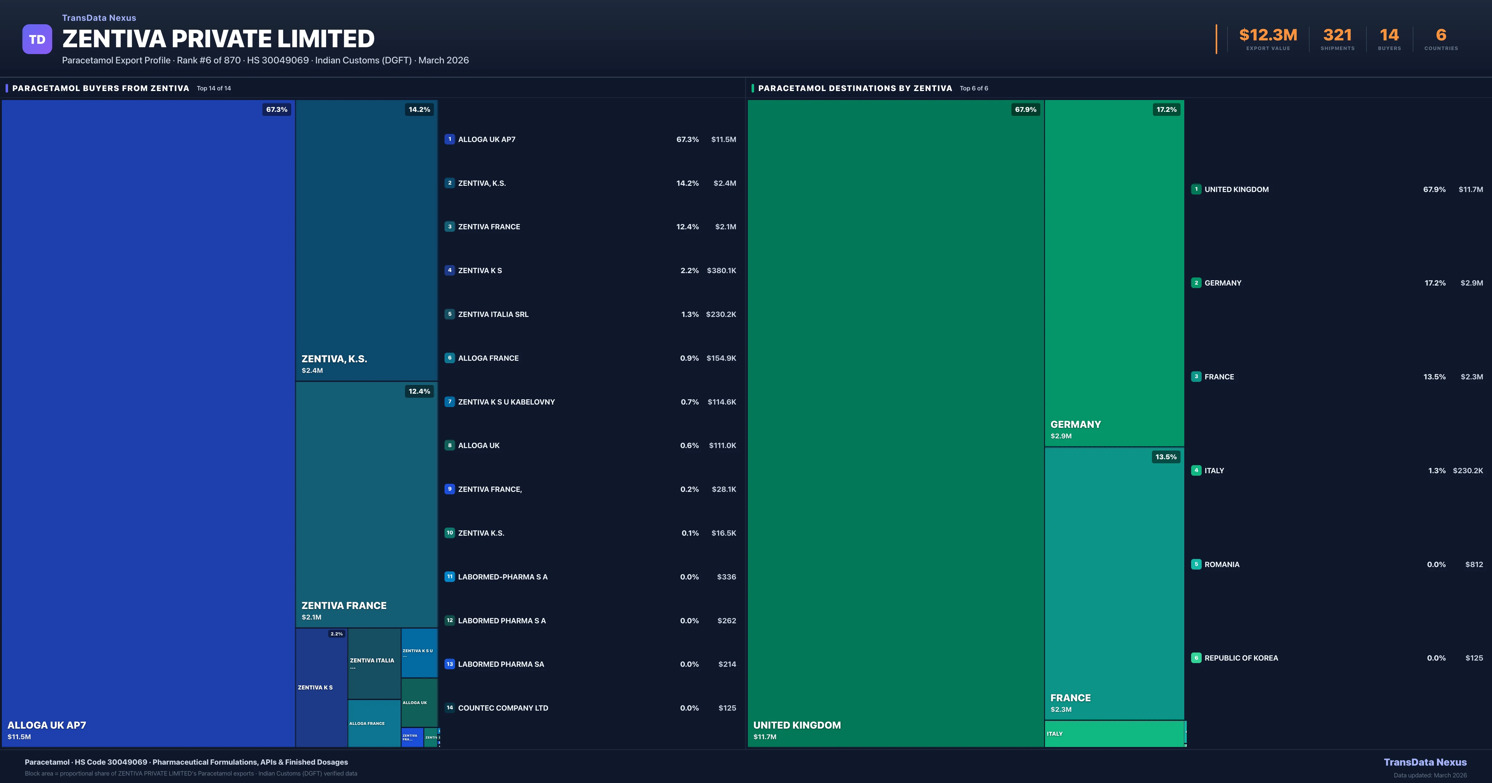 Zentiva Private Limited supplies Paracetamol to 14 buyers globally. The largest buyer is ALLOGA UK AP7 (UNITED KINGDOM), followed by ZENTIVA, K.S. (GERMANY) and ZENTIVA FRANCE (FRANCE). These buyers represent pharmaceutical distributors, hospital groups, and government procurement agencies in their respective markets.