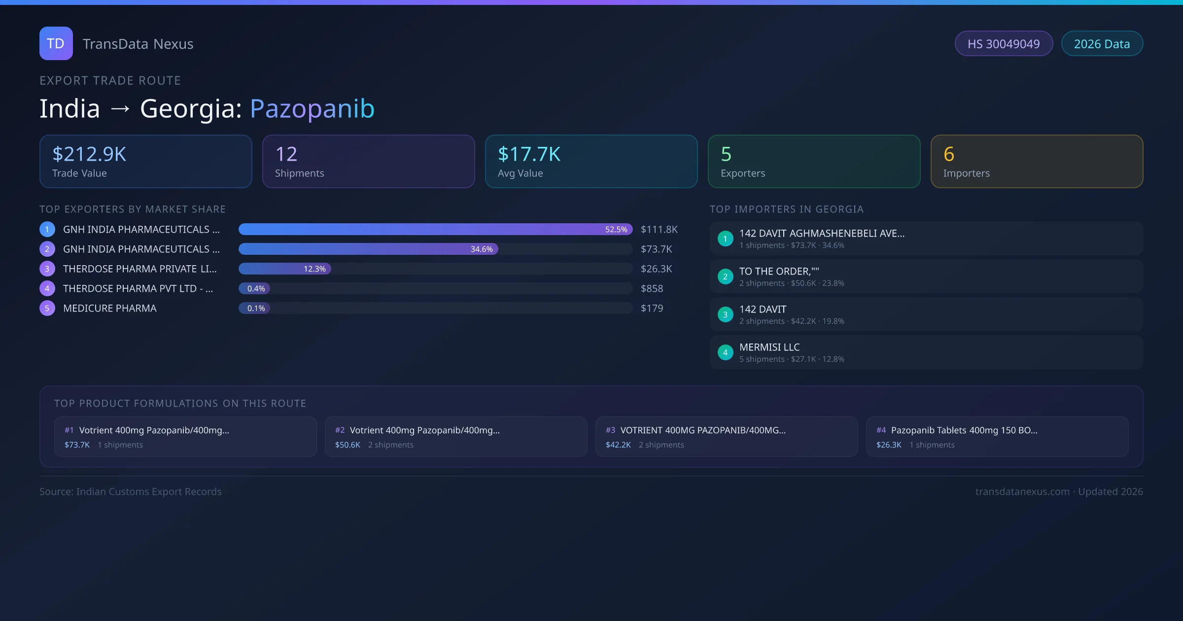 India has recorded 12 verified shipments of Pazopanib exported to Georgia, representing a combined trade value of $212.9K USD. This corridor is served by 5 active Indian exporters, with an average shipment value of $17.7K USD. The leading Indian exporter is GNH INDIA PHARMACEUTICALS LIMITED , which accounts for 53% of total export value with 5 shipments worth $111.8K USD. On the buying side, 142 DAVIT AGHMASHENEBELI AVENUE, is the largest importer in Georgia with $73.7K USD in purchases. The top 3 suppliers — GNH INDIA PHARMACEUTICALS LIMITED , GNH INDIA PHARMACEUTICALS LIMITED, THERDOSE PHARMA PRIVATE LIMITED — together control 100% of total trade value on this route. All data sourced from Indian Customs (DGFT) shipping bill records. Values reported in FOB USD.