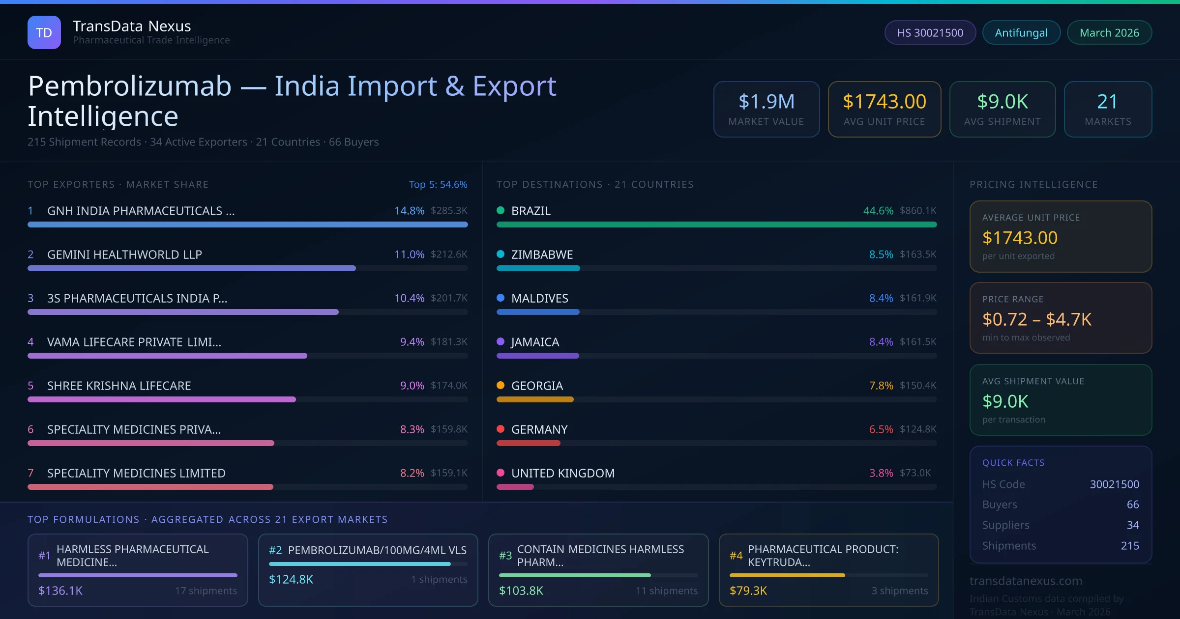 The total export value of pembrolizumab from India is $1.9M, recorded across 215 shipments from 34 active exporters to 21 countries. The average shipment value is $9.0K.