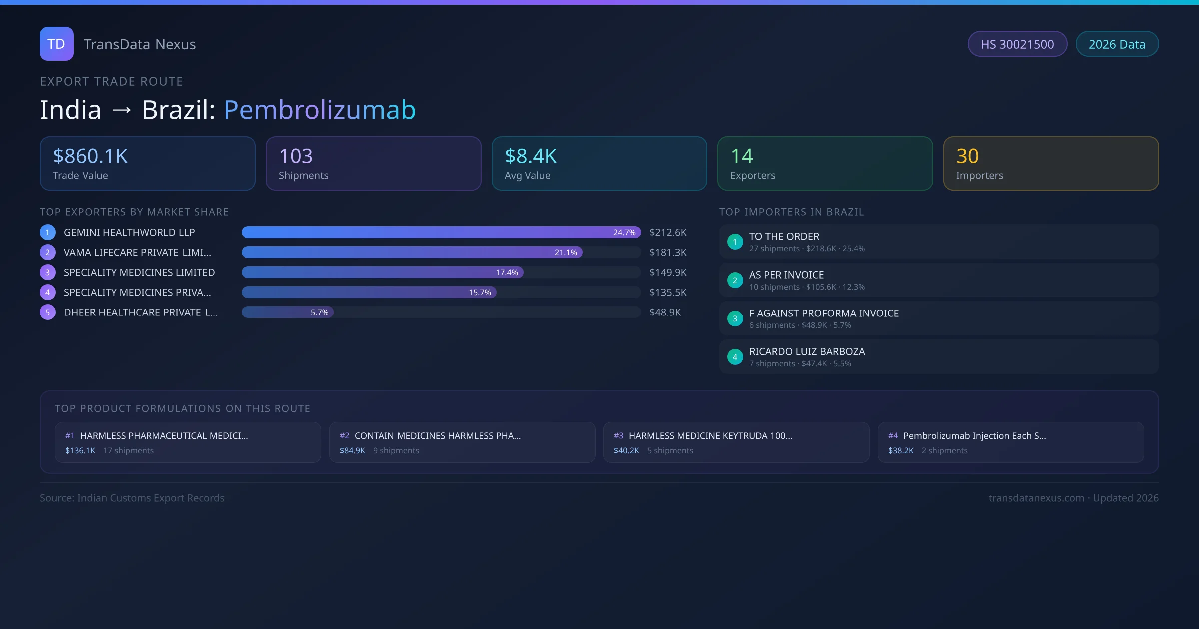 India has recorded 103 verified shipments of Pembrolizumab exported to Brazil, representing a combined trade value of $860.1K USD. This corridor is served by 14 active Indian exporters, with an average shipment value of $8.4K USD. The leading Indian exporter is GEMINI HEALTHWORLD LLP, which accounts for 25% of total export value with 26 shipments worth $212.6K USD. On the buying side, TO THE ORDER is the largest importer in Brazil with $218.6K USD in purchases. The top 3 suppliers — GEMINI HEALTHWORLD LLP, VAMA LIFECARE PRIVATE LIMITED, SPECIALITY MEDICINES LIMITED — together control 63% of total trade value on this route. All data sourced from Indian Customs (DGFT) shipping bill records. Values reported in FOB USD.