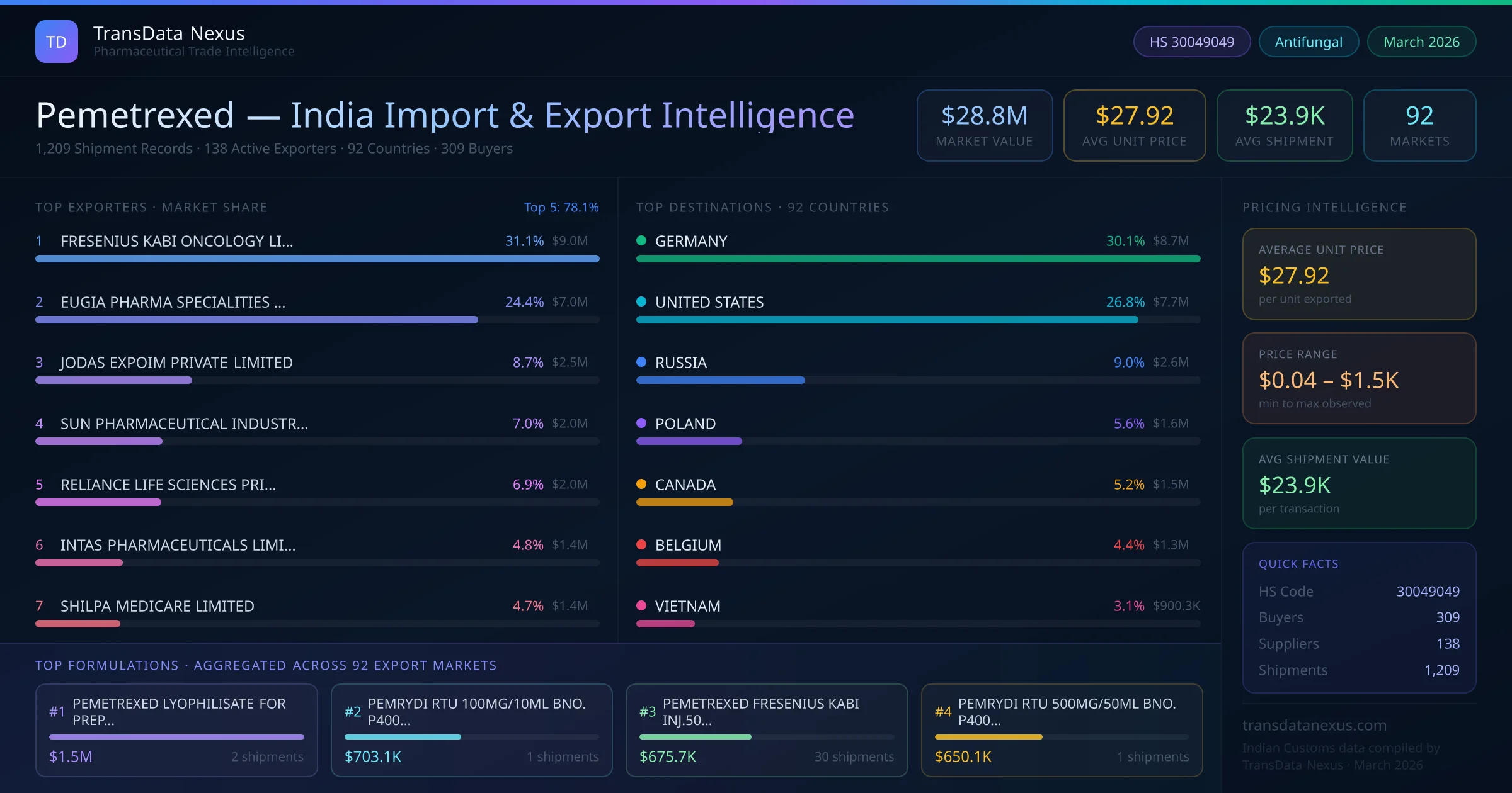Between 2022 and 2026, India exported $28.8M worth of pemetrexed across 1,209 verified shipments to 92 countries — covering 47% of world markets in the Advanced Oncology segment. The largest destination is GERMANY (30.1%). FRESENIUS KABI ONCOLOGY LIMITED leads with a 31.1% share. All figures are drawn from Indian Customs (DGFT) shipping bill records spanning four years of trade activity.