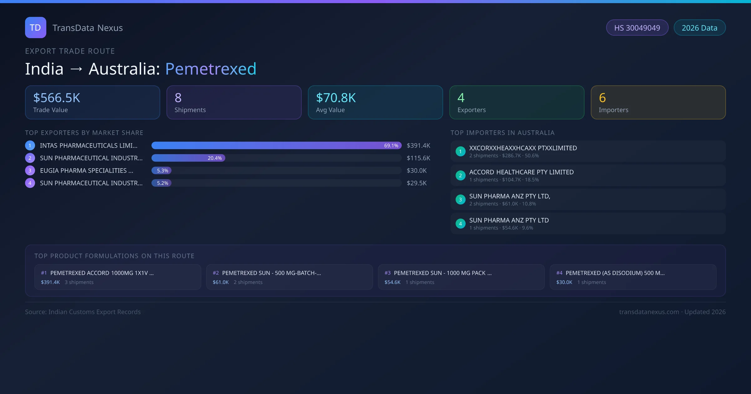 India exports Pemetrexed to Australia worth approximately $566.5K USD across 8 recorded shipments. The average value per shipment is $70.8K USD.
