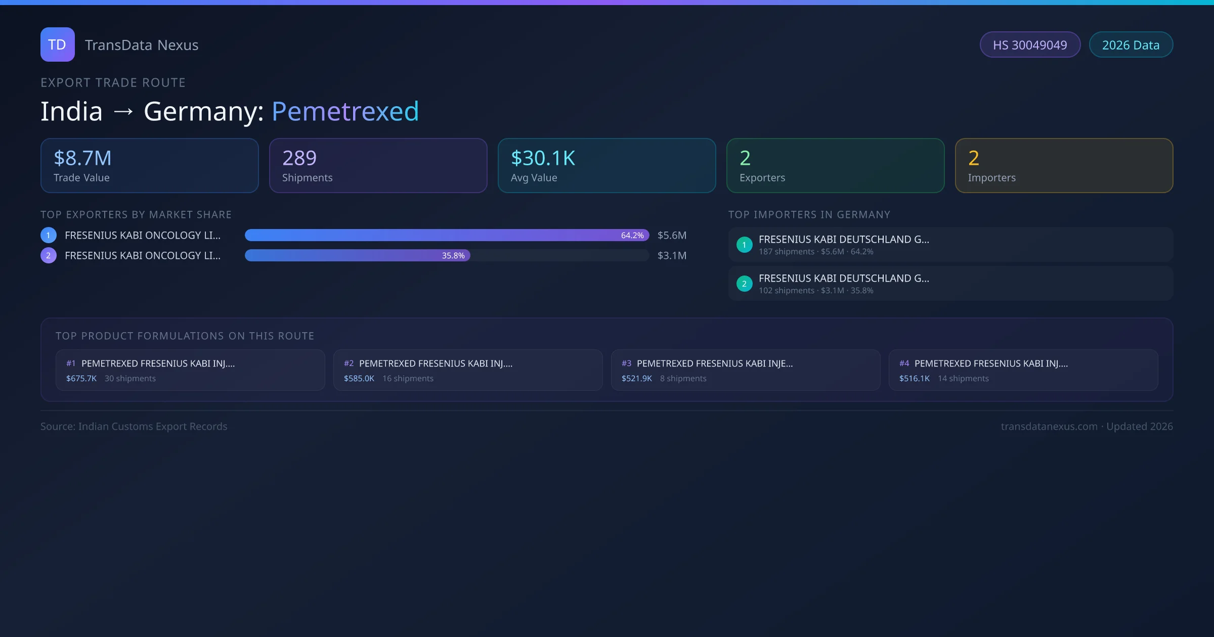 The India to Germany Pemetrexed corridor is one of India's established pharmaceutical export routes, with 289 shipments documented worth a combined $8.7M USD. The route is dominated by FRESENIUS KABI ONCOLOGY LIMITED, which alone accounts for roughly 64% of all export value, reflecting the consolidated nature of India's pemetrexed manufacturing sector.