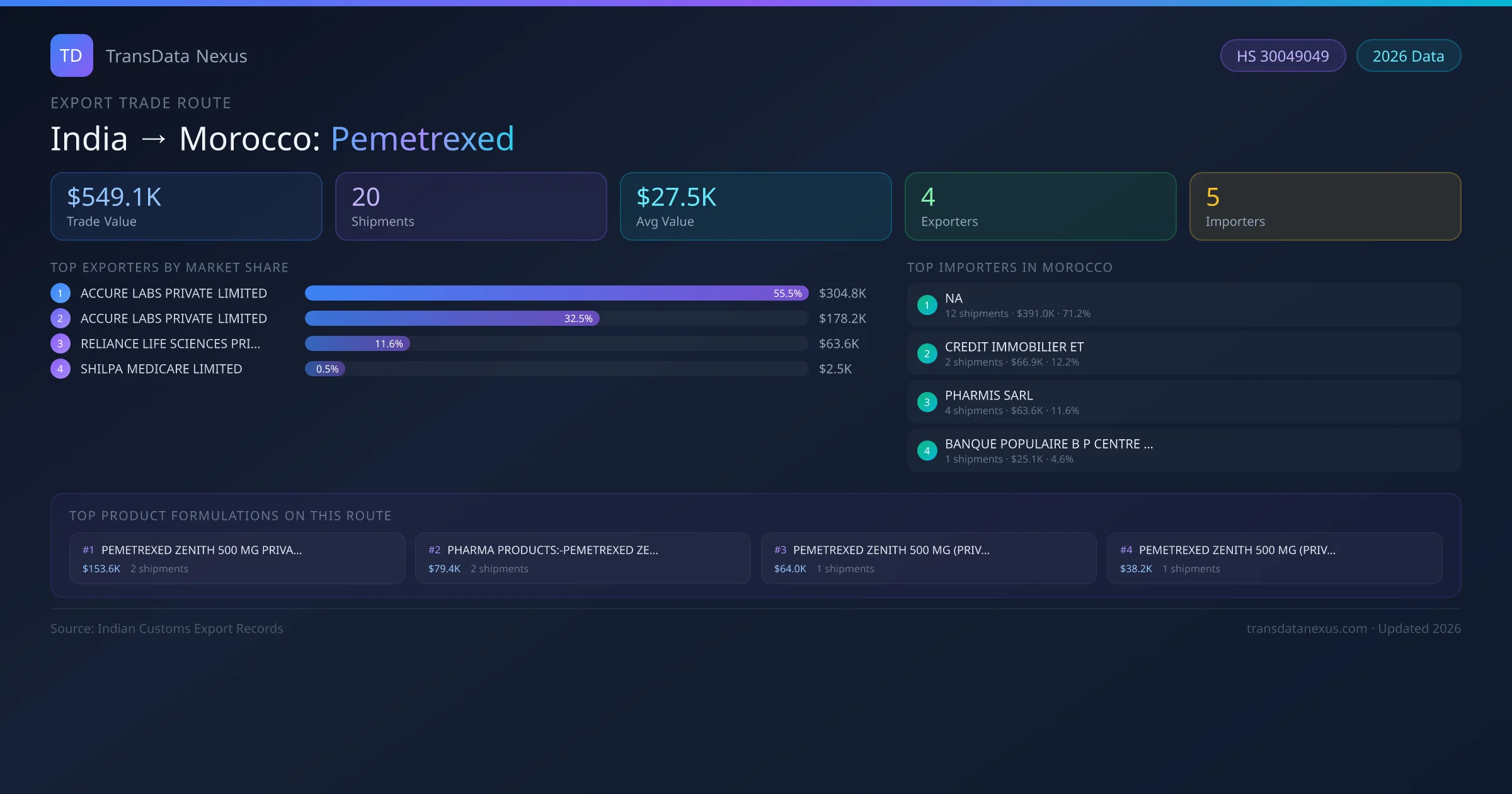 The India to Morocco Pemetrexed corridor is one of India's established pharmaceutical export routes, with 20 shipments documented worth a combined $549.1K USD. The route is dominated by ACCURE LABS PRIVATE LIMITED, which alone accounts for roughly 56% of all export value, reflecting the consolidated nature of India's pemetrexed manufacturing sector.