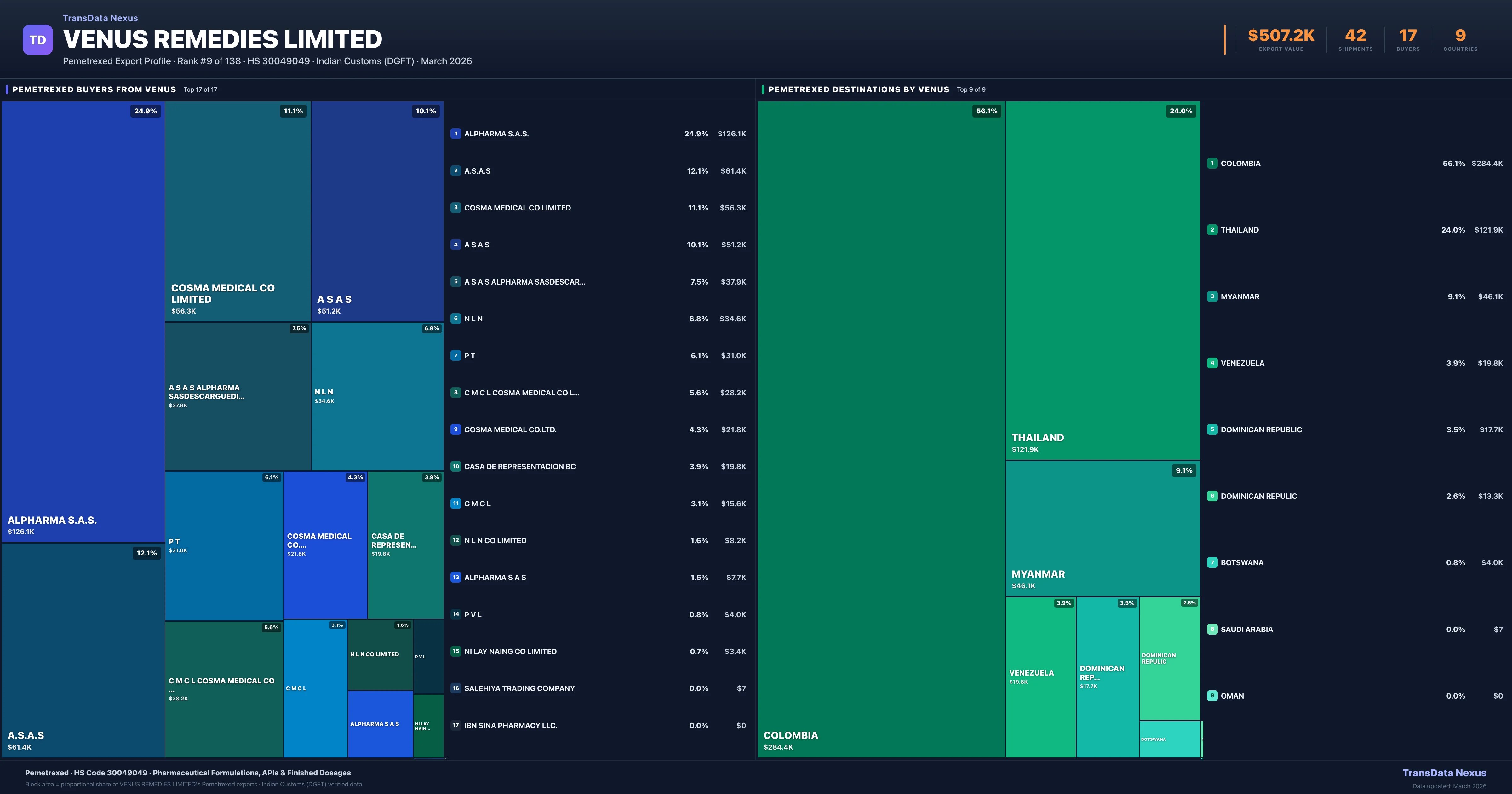 Venus Remedies Limited supplies Pemetrexed to 17 buyers globally. The largest buyer is ALPHARMA S.A.S. (COLOMBIA), followed by A.S.A.S (COLOMBIA) and COSMA MEDICAL CO LIMITED (THAILAND). These buyers represent pharmaceutical distributors, hospital groups, and government procurement agencies in their respective markets.
