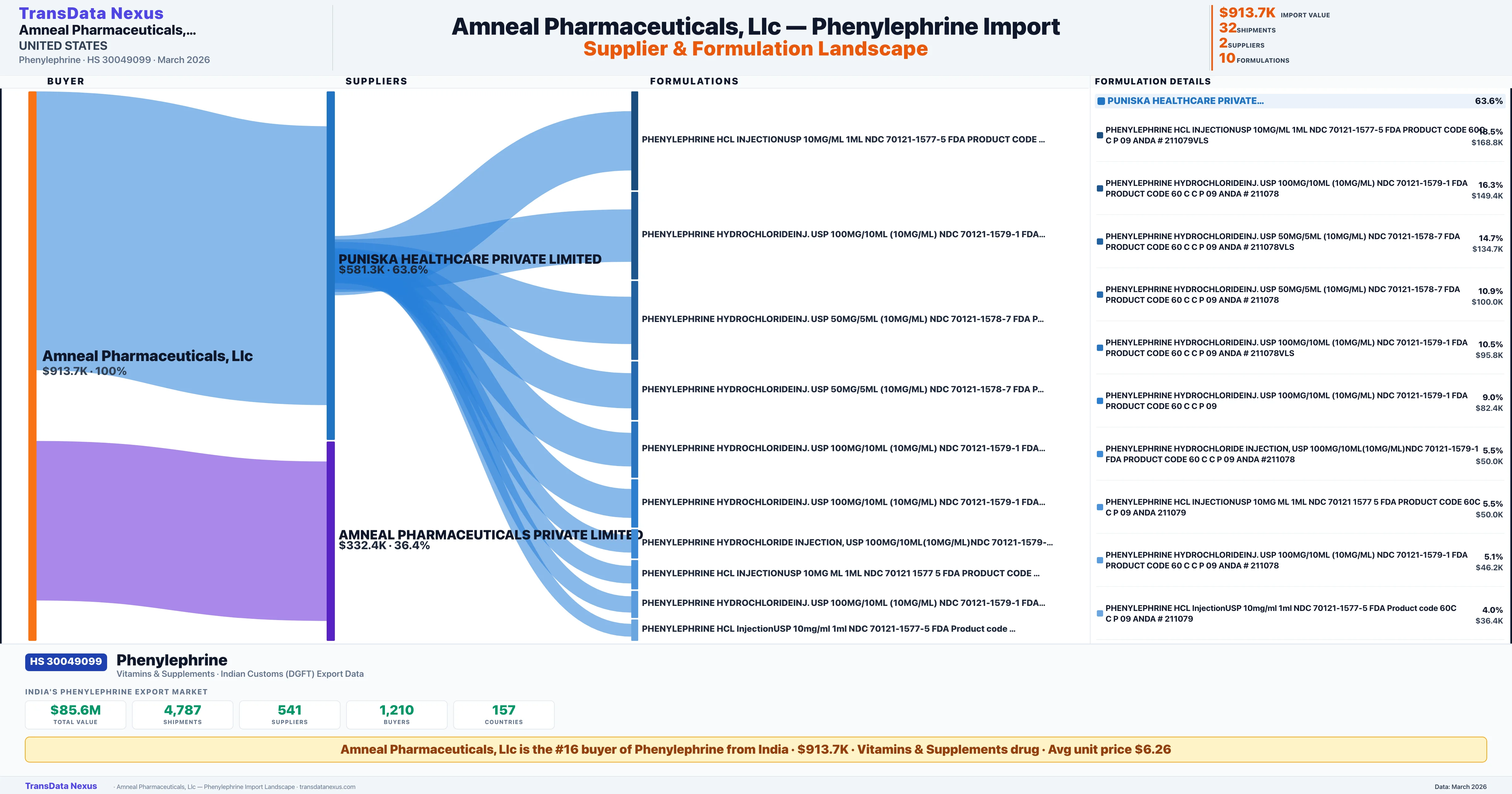 AMNEAL PHARMACEUTICALS LLC sources Phenylephrine from 2 verified Indian suppliers: PUNISKA HEALTHCARE PRIVATE LIMITED ($581.3K, 63.6%), AMNEAL PHARMACEUTICALS PRIVATE LIMITED ($332.4K, 36.4%). This is based on 32 customs records.
