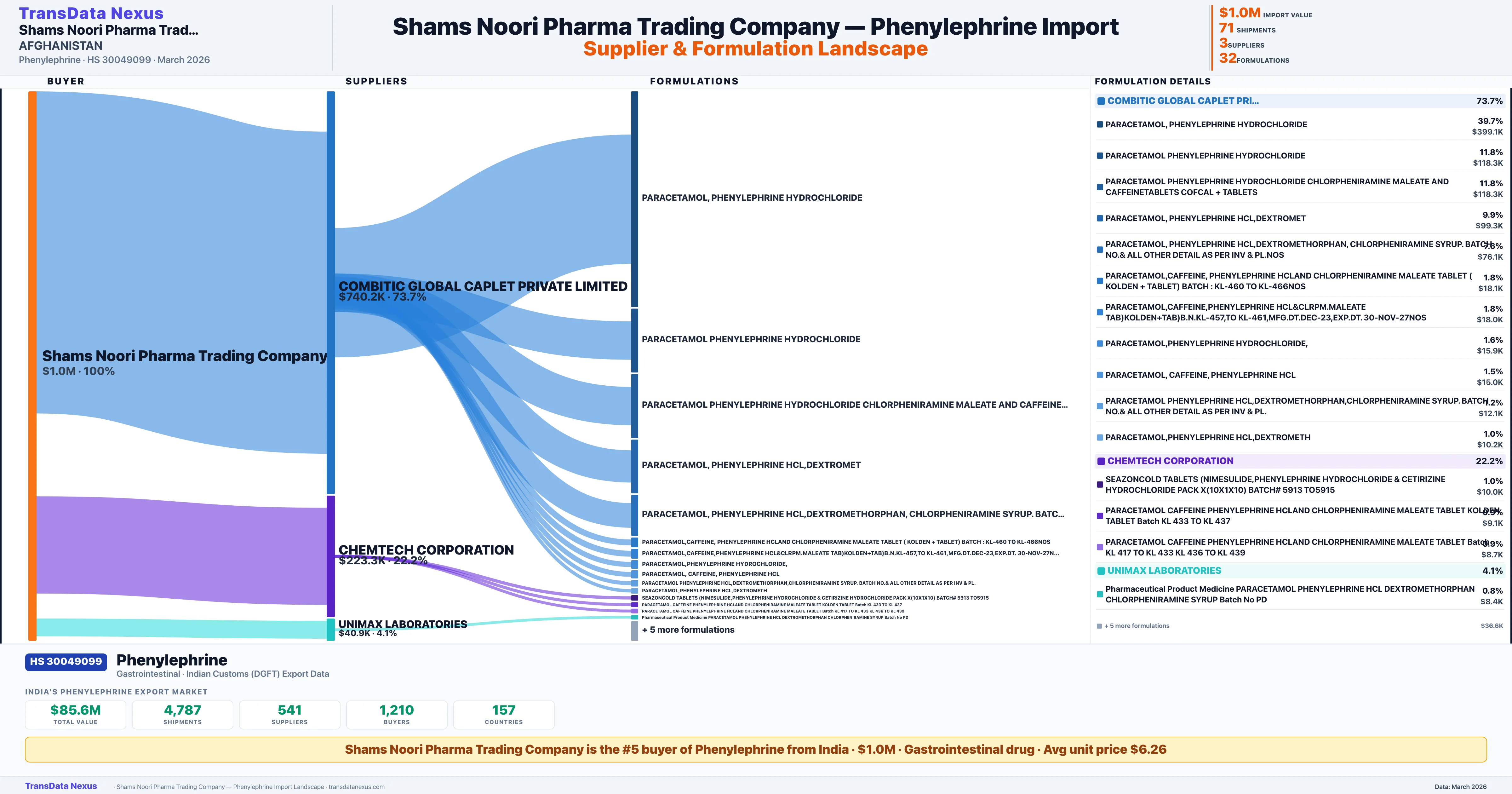 SHAMS NOORI PHARMA TRADING COMPANY sources Phenylephrine from 3 verified Indian suppliers based on 71 customs records. The primary supplier is COMBITIC GLOBAL CAPLET PRIVATE LIMITED accounting for 73.7% of imports.