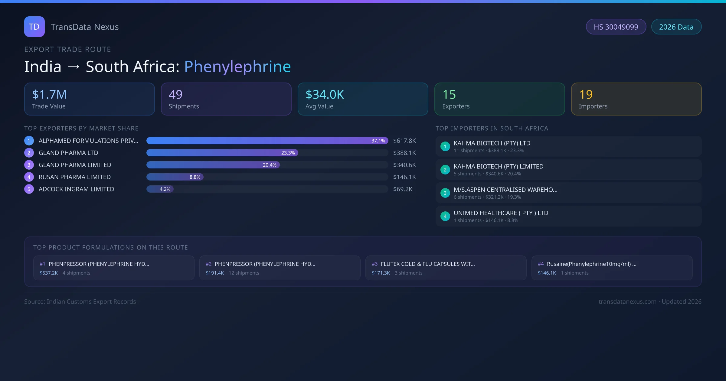 - 1.Route Identification: India to South Africa export trade corridor identified from Indian Customs (DGFT) records for Phenylephrine.