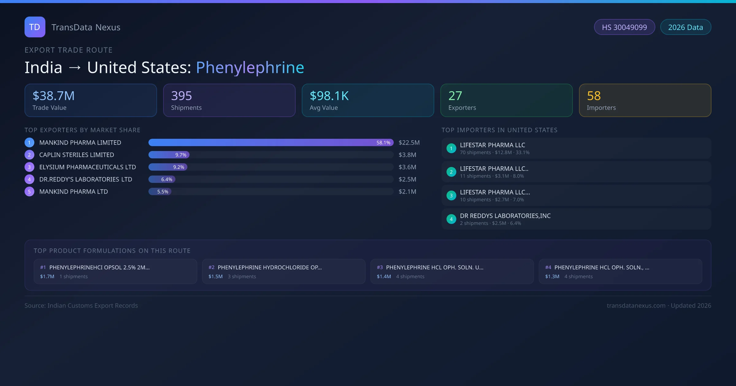 The India to United States Phenylephrine corridor is one of India's established pharmaceutical export routes, with 395 shipments documented worth a combined $38.7M USD. The route is dominated by MANKIND PHARMA LIMITED, which alone accounts for roughly 58% of all export value, reflecting the consolidated nature of India's phenylephrine manufacturing sector.