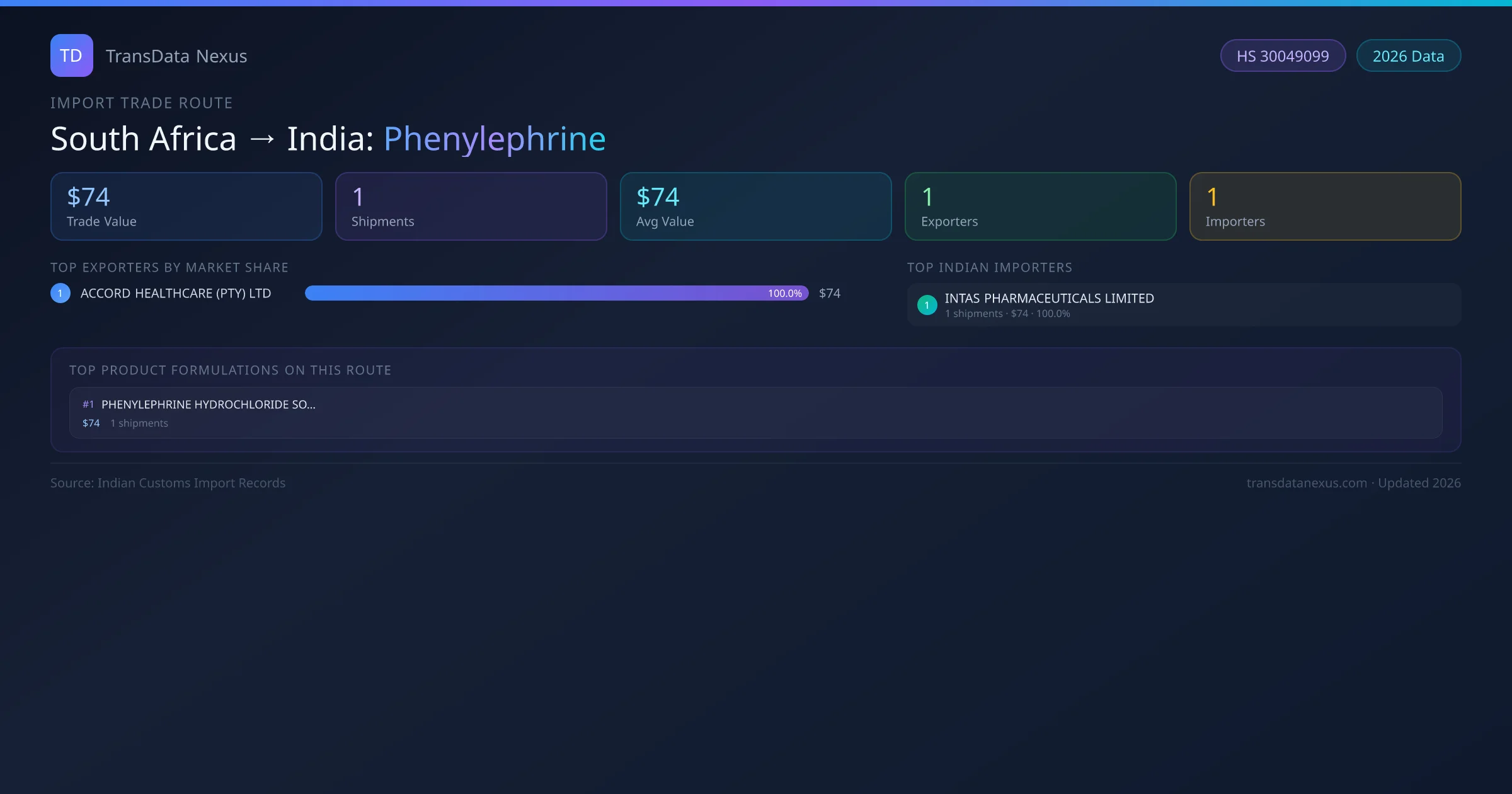 On the buying side, INTAS PHARMACEUTICALS LIMITED is the largest importer with 1 shipments worth $74 USD — representing 100% of all phenylephrine imports from South Africa on this route.