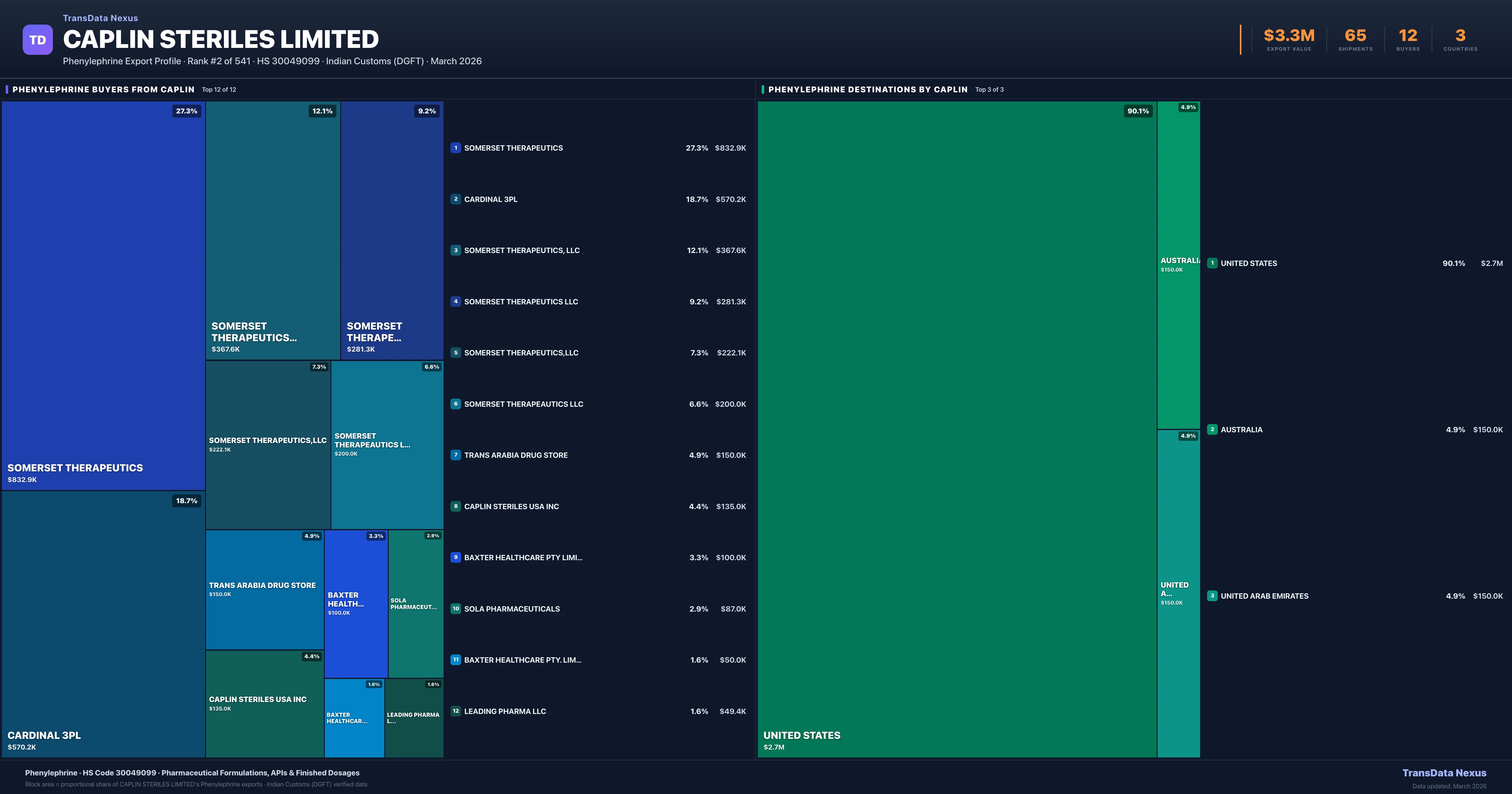 Caplin Steriles Limited supplies Phenylephrine to 12 buyers globally. The largest buyer is SOMERSET THERAPEUTICS (UNITED STATES), followed by CARDINAL 3PL (UNITED STATES) and SOMERSET THERAPEUTICS, LLC (UNITED STATES). These buyers represent pharmaceutical distributors, hospital groups, and government procurement agencies in their respective markets.