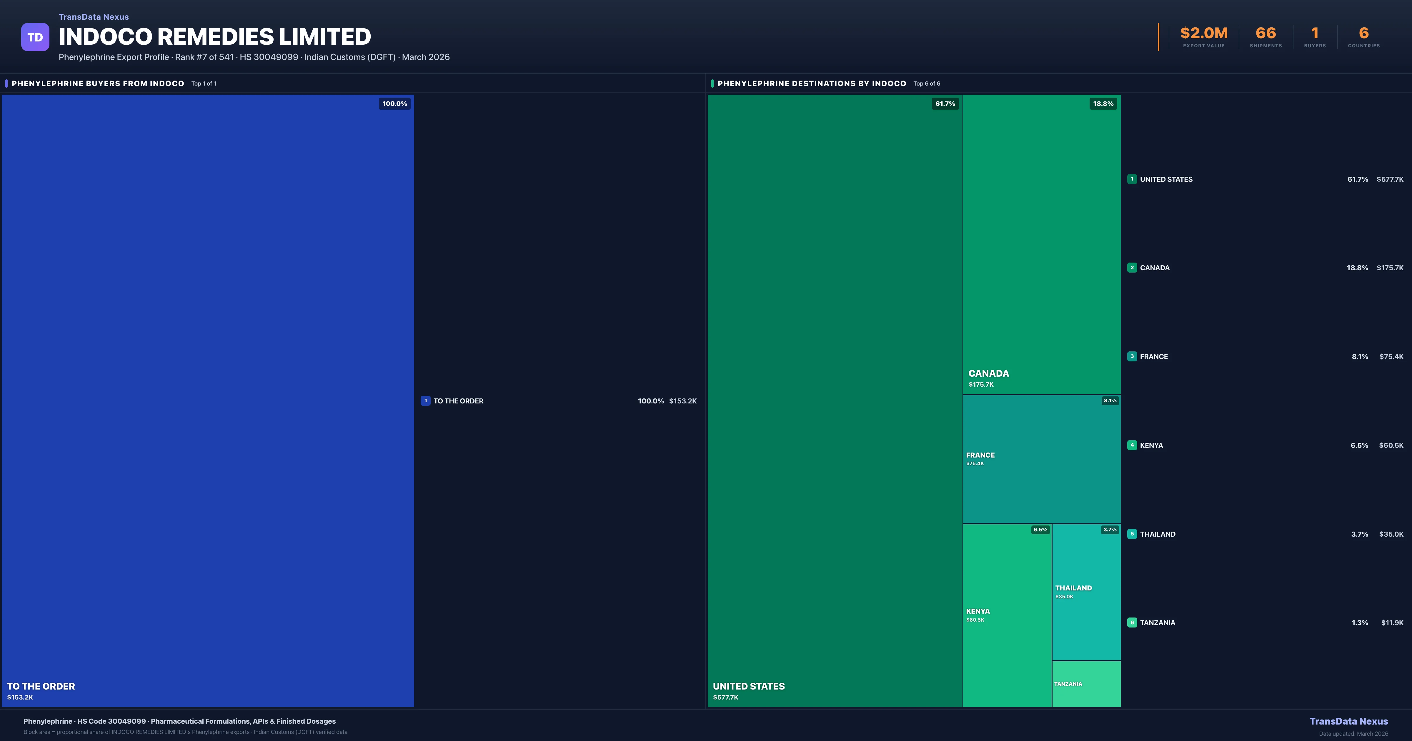 Access shipment-level details, pricing data, buyer connections, and competitive analysis for Indoco Remedies Limited's Phenylephrine exports. TransData Nexus provides verified Indian Customs (DGFT) data trusted by pharmaceutical trade professionals worldwide.