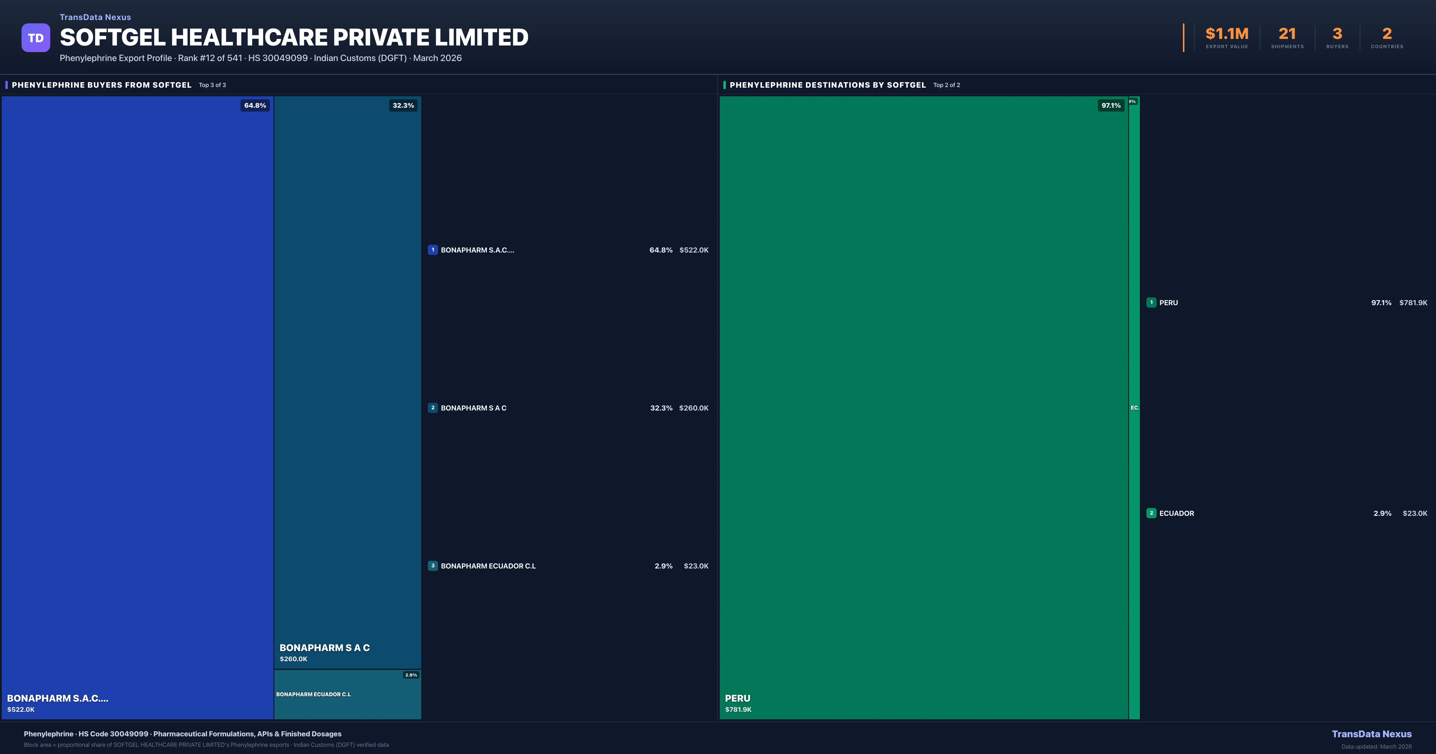Softgel Healthcare Private Limited supplies Phenylephrine to 3 buyers globally. The largest buyer is BONAPHARM S.A.C.... (PERU), followed by BONAPHARM S A C (PERU) and BONAPHARM ECUADOR C.L (ECUADOR). These buyers represent pharmaceutical distributors, hospital groups, and government procurement agencies in their respective markets.