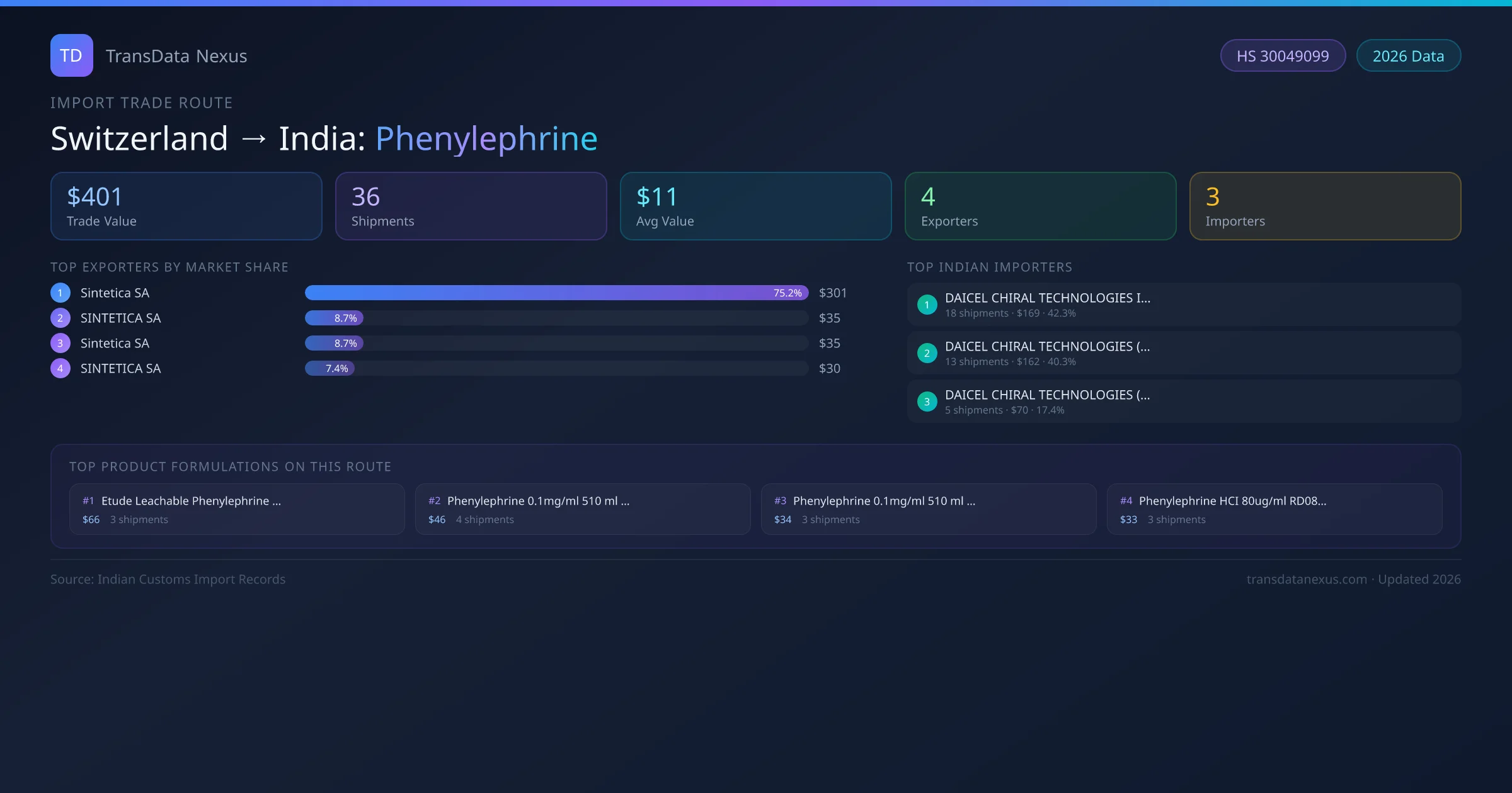 The Switzerland to India Phenylephrine corridor is one of India's established pharmaceutical import routes from Switzerland, with 36 shipments documented worth a combined $401 USD. The route is dominated by Sintetica SA, which alone accounts for roughly 75% of all import value, reflecting the consolidated nature of Switzerland's phenylephrine export sector.