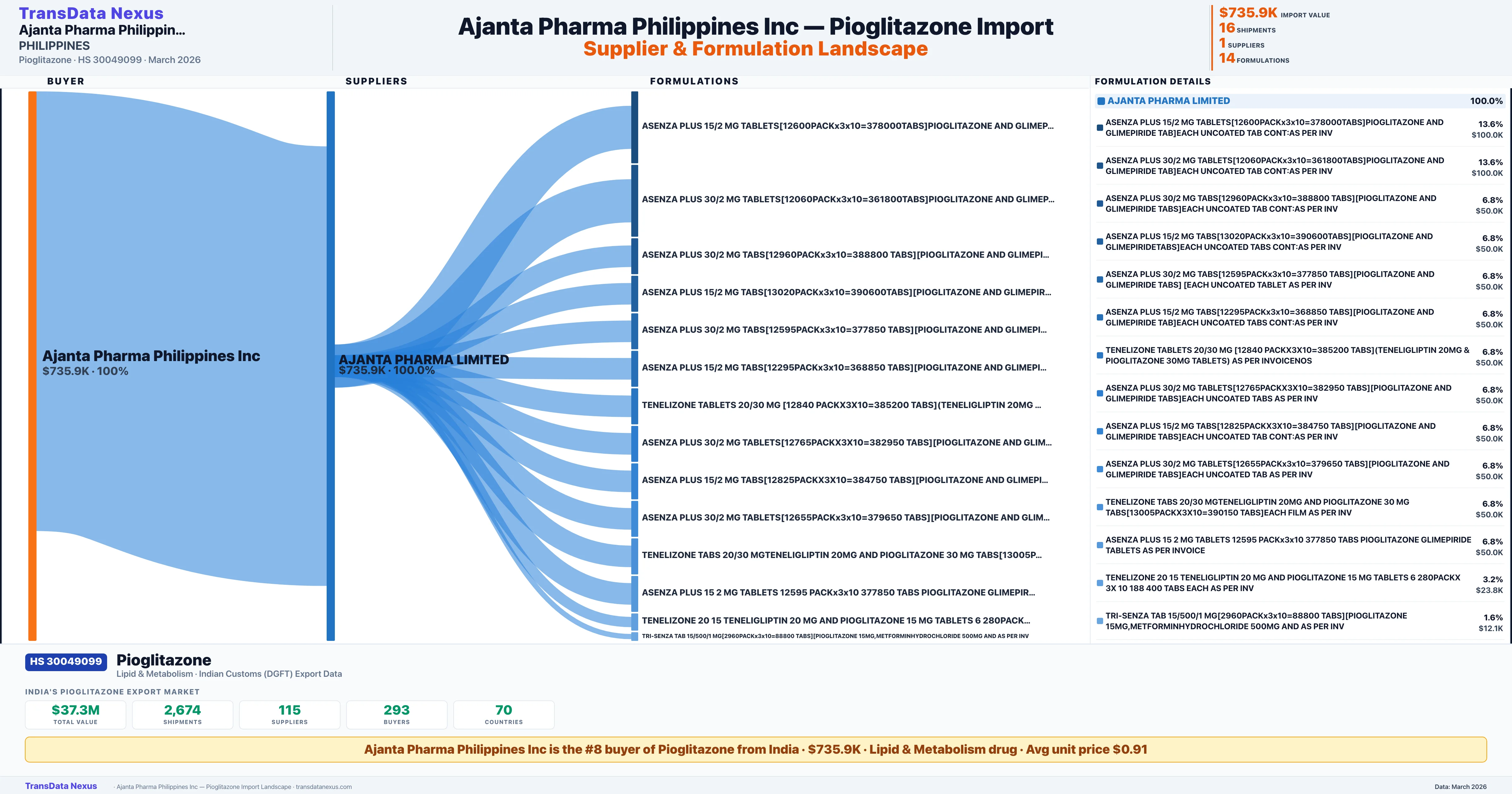 AJANTA PHARMA PHILIPPINES INC sources Pioglitazone from 1 verified Indian supplier: AJANTA PHARMA LIMITED ($735.9K, 100.0%). This is based on 16 customs records.