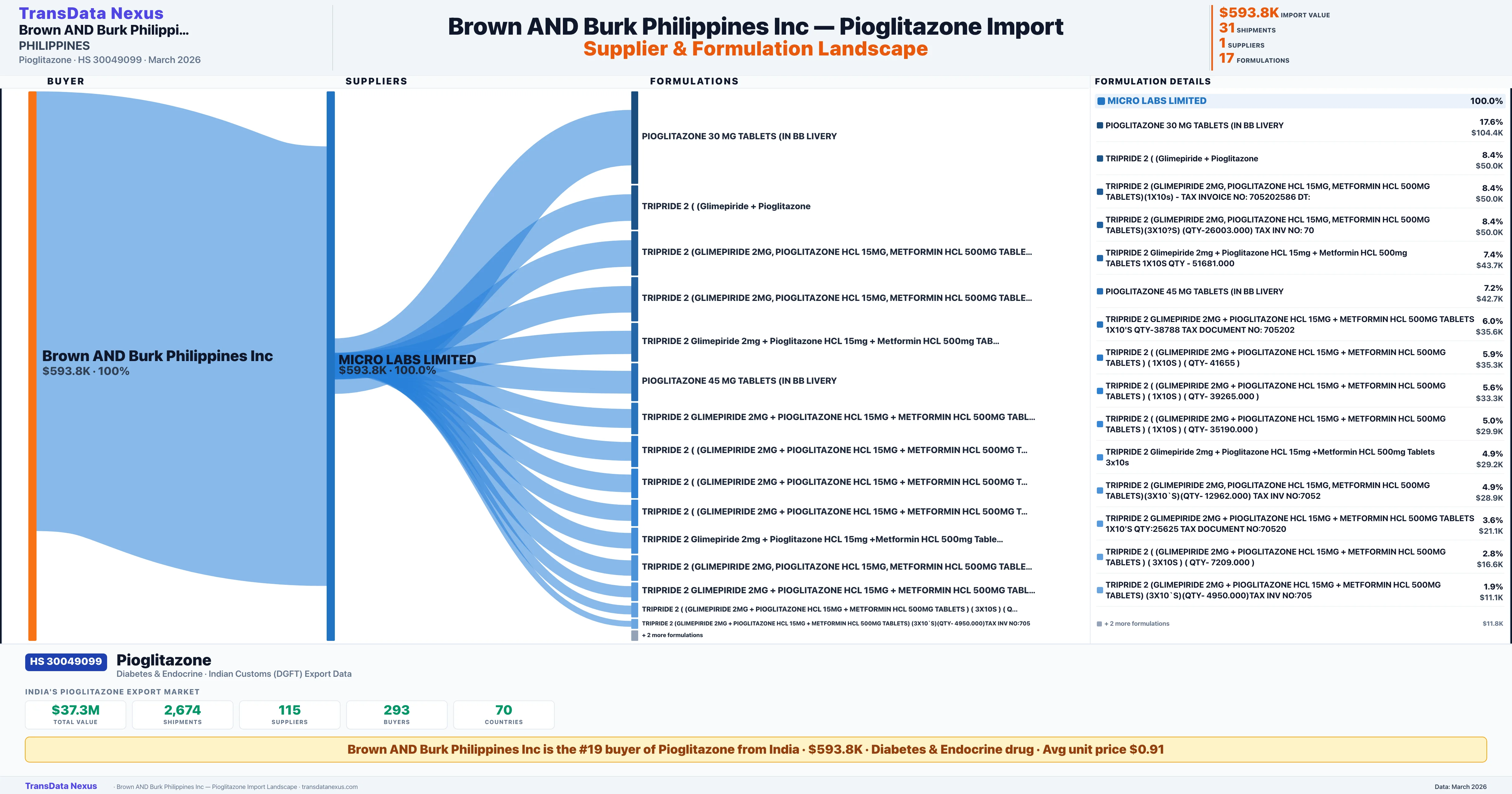 BROWN AND BURK PHILIPPINES INC sources Pioglitazone from 1 verified Indian supplier: MICRO LABS LIMITED ($593.8K, 100.0%). This is based on 31 customs records.