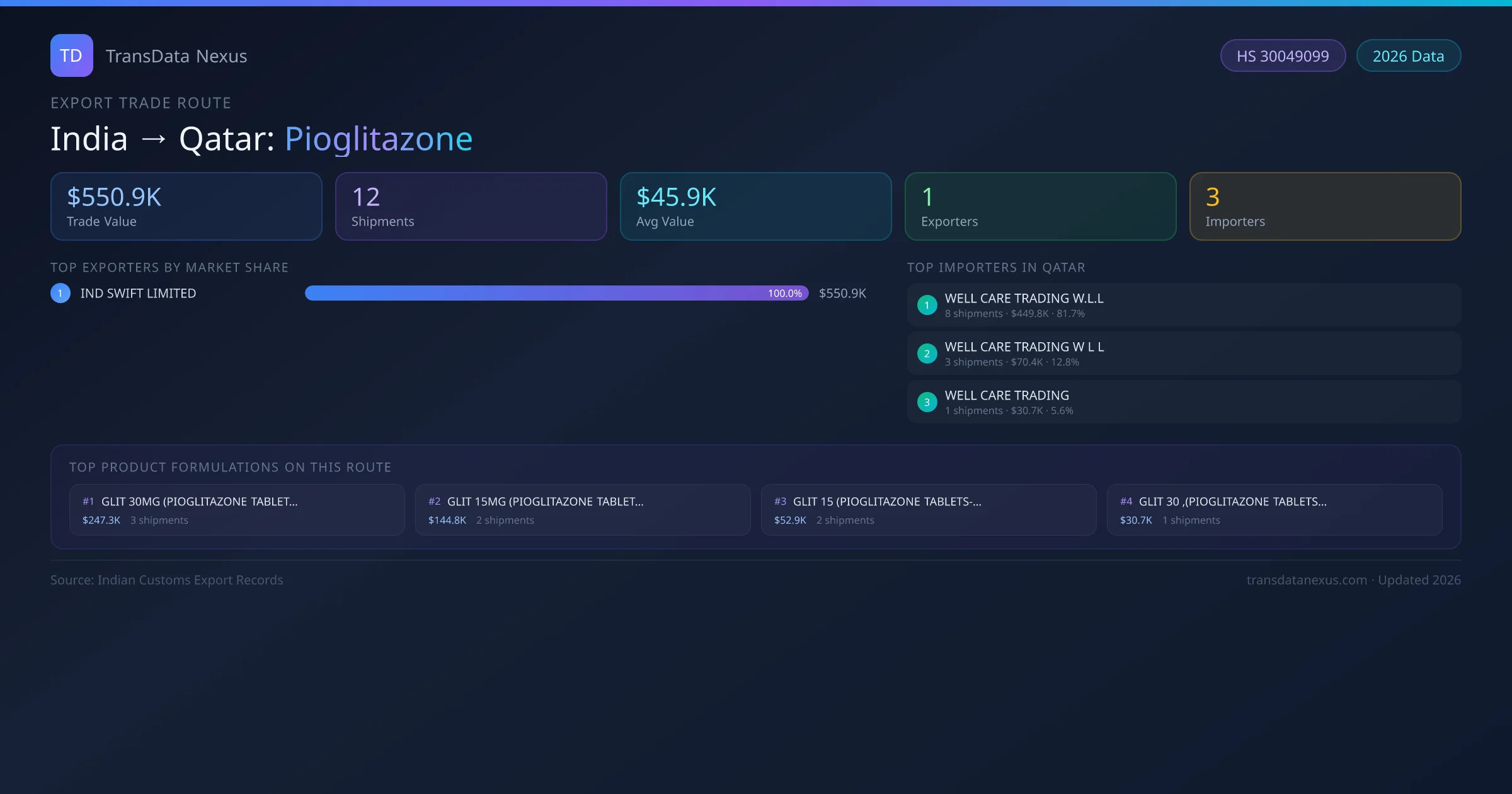India has recorded 12 verified shipments of Pioglitazone exported to Qatar, representing a combined trade value of $550.9K USD. This corridor is served by 1 active Indian exporters, with an average shipment value of $45.9K USD. The leading Indian exporter is IND SWIFT LIMITED, which accounts for 100% of total export value with 12 shipments worth $550.9K USD. On the buying side, WELL CARE TRADING W.L.L is the largest importer in Qatar with $449.8K USD in purchases. All data sourced from Indian Customs (DGFT) shipping bill records. Values reported in FOB USD.