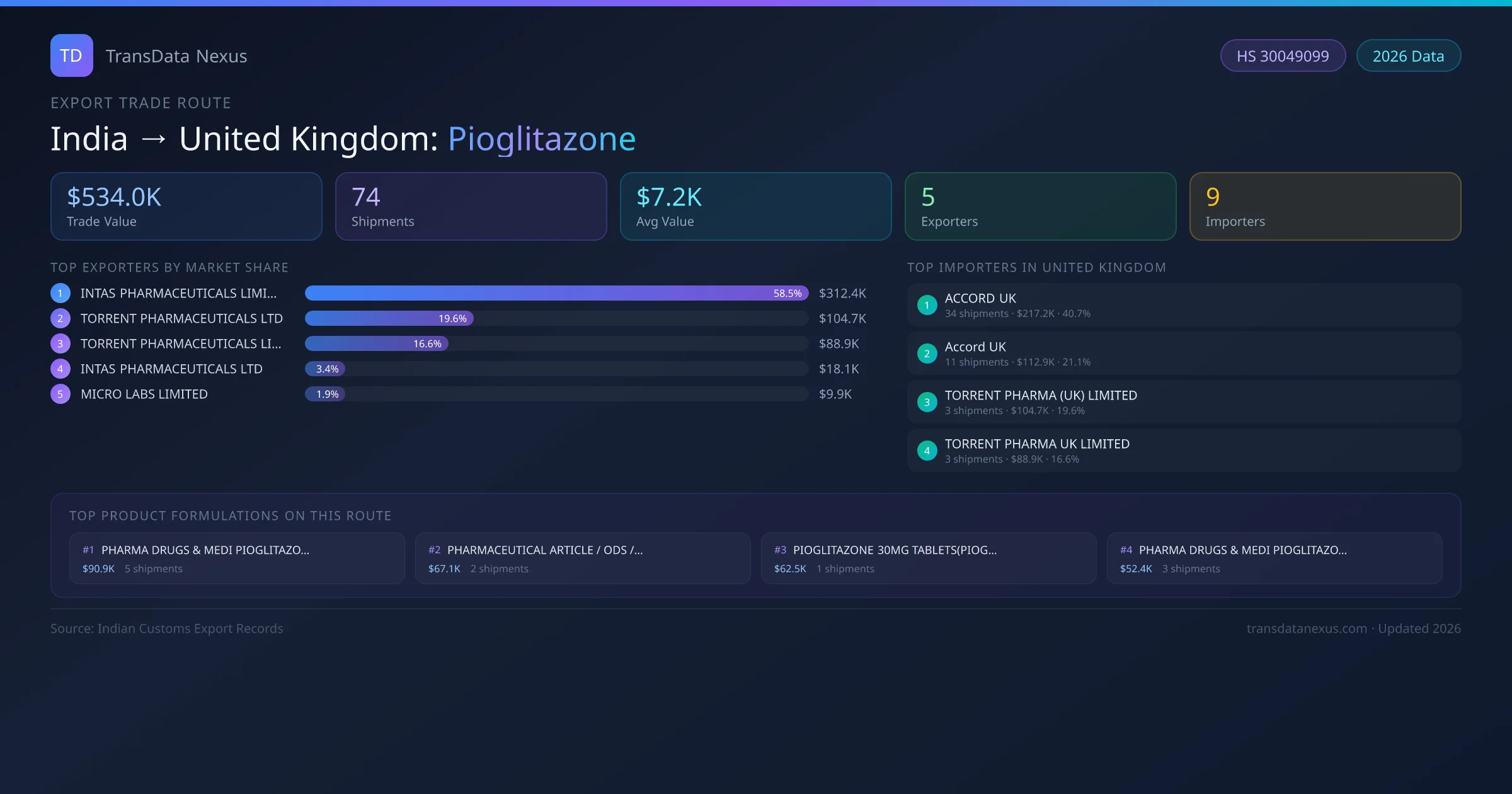 India has recorded 74 verified shipments of Pioglitazone exported to United Kingdom, representing a combined trade value of $534.0K USD. This corridor is served by 5 active Indian exporters, with an average shipment value of $7.2K USD. The leading Indian exporter is INTAS PHARMACEUTICALS LIMITED, which accounts for 58% of total export value with 64 shipments worth $312.4K USD. On the buying side, ACCORD UK is the largest importer in United Kingdom with $217.2K USD in purchases. The top 3 suppliers — INTAS PHARMACEUTICALS LIMITED, TORRENT PHARMACEUTICALS LTD, TORRENT PHARMACEUTICALS LIMITED — together control 95% of total trade value on this route. All data sourced from Indian Customs (DGFT) shipping bill records. Values reported in FOB USD.