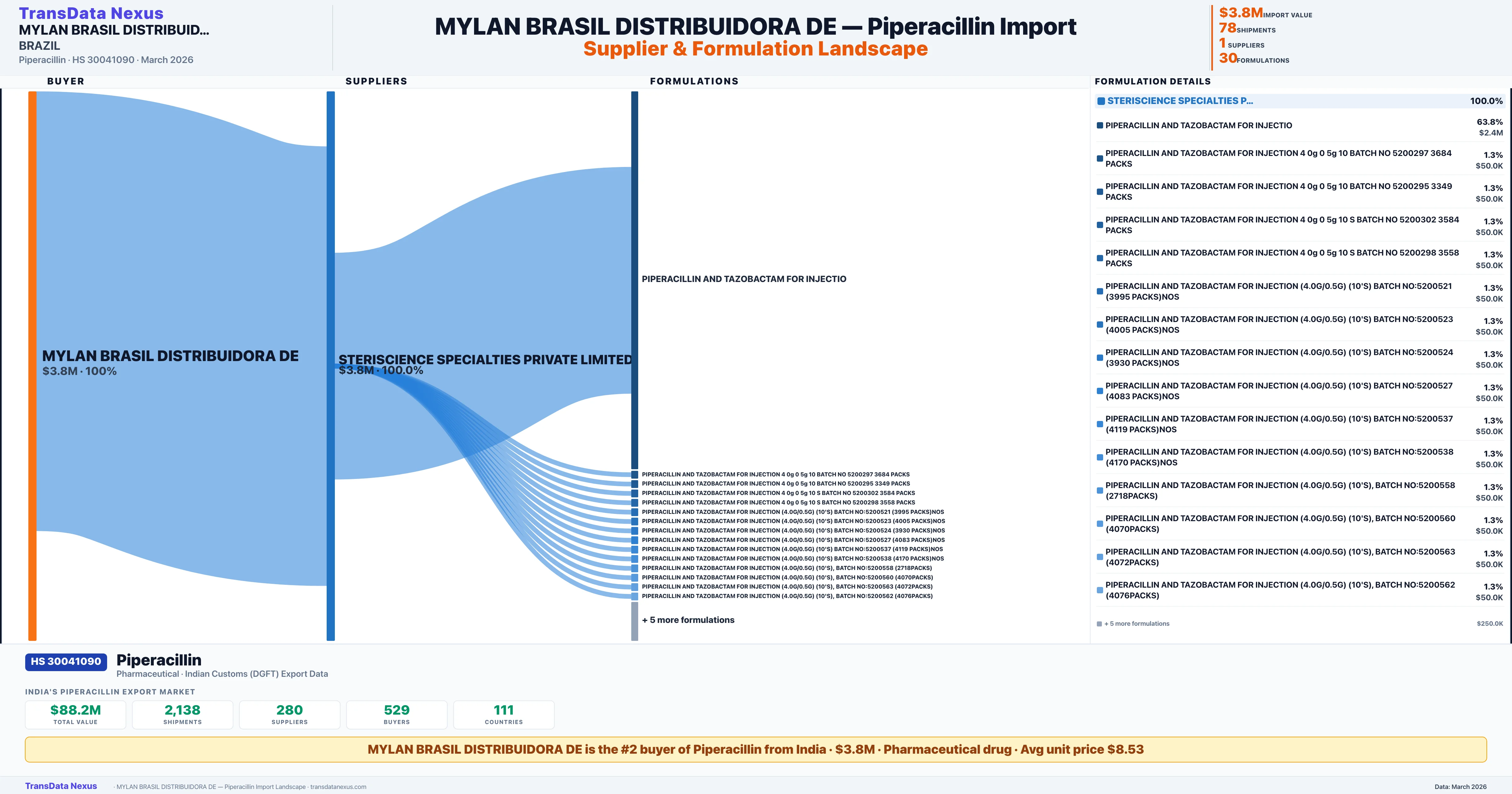 MYLAN BRASIL DISTRIBUIDORA DE sources Piperacillin from 1 verified Indian supplier: STERISCIENCE SPECIALTIES PRIVATE LIMITED ($3.8M, 100.0%). This is based on 78 customs records.