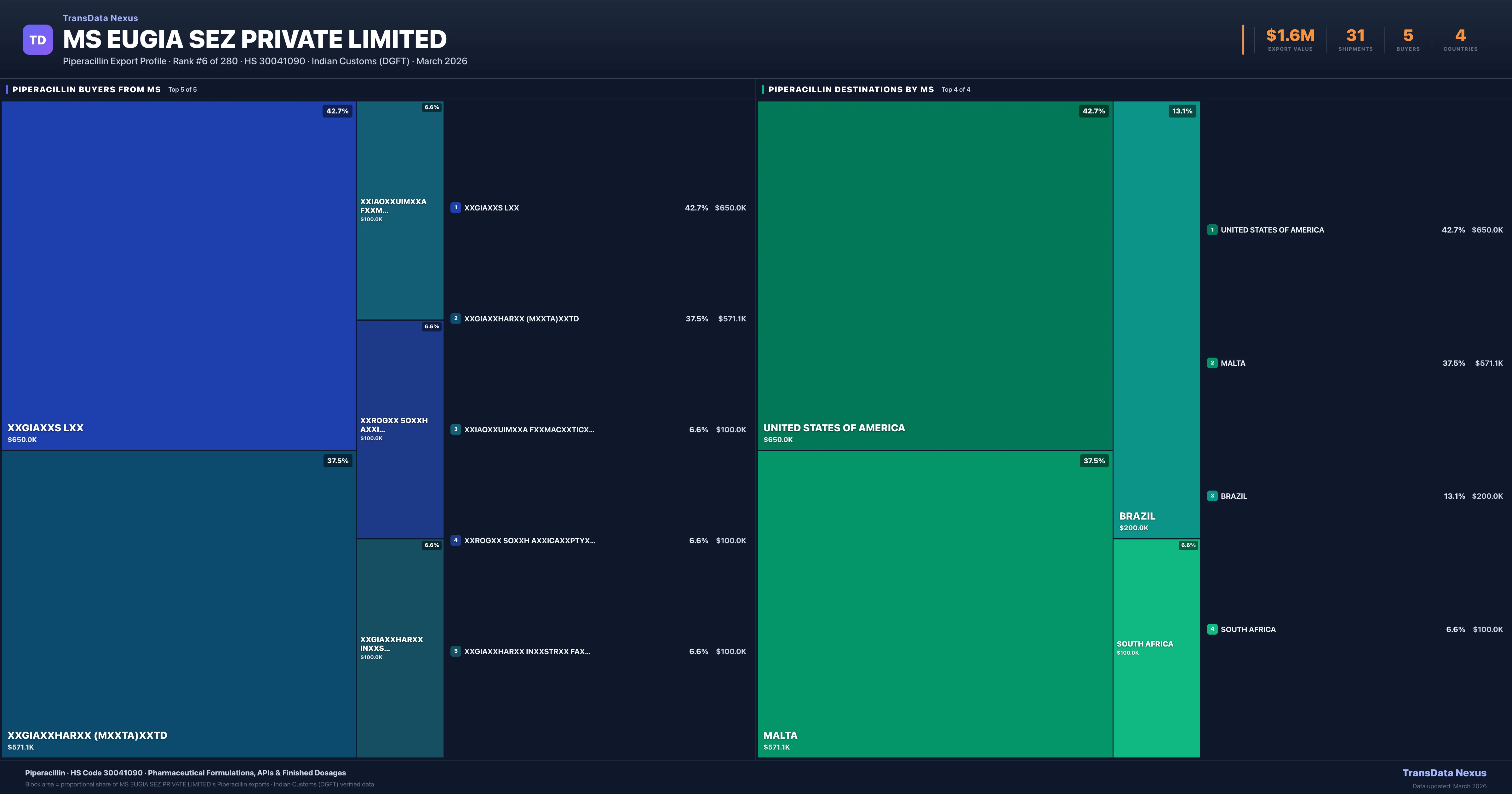 MS Eugia SEZ Private Limited — Piperacillin Export Profile: Buyers & Destinations