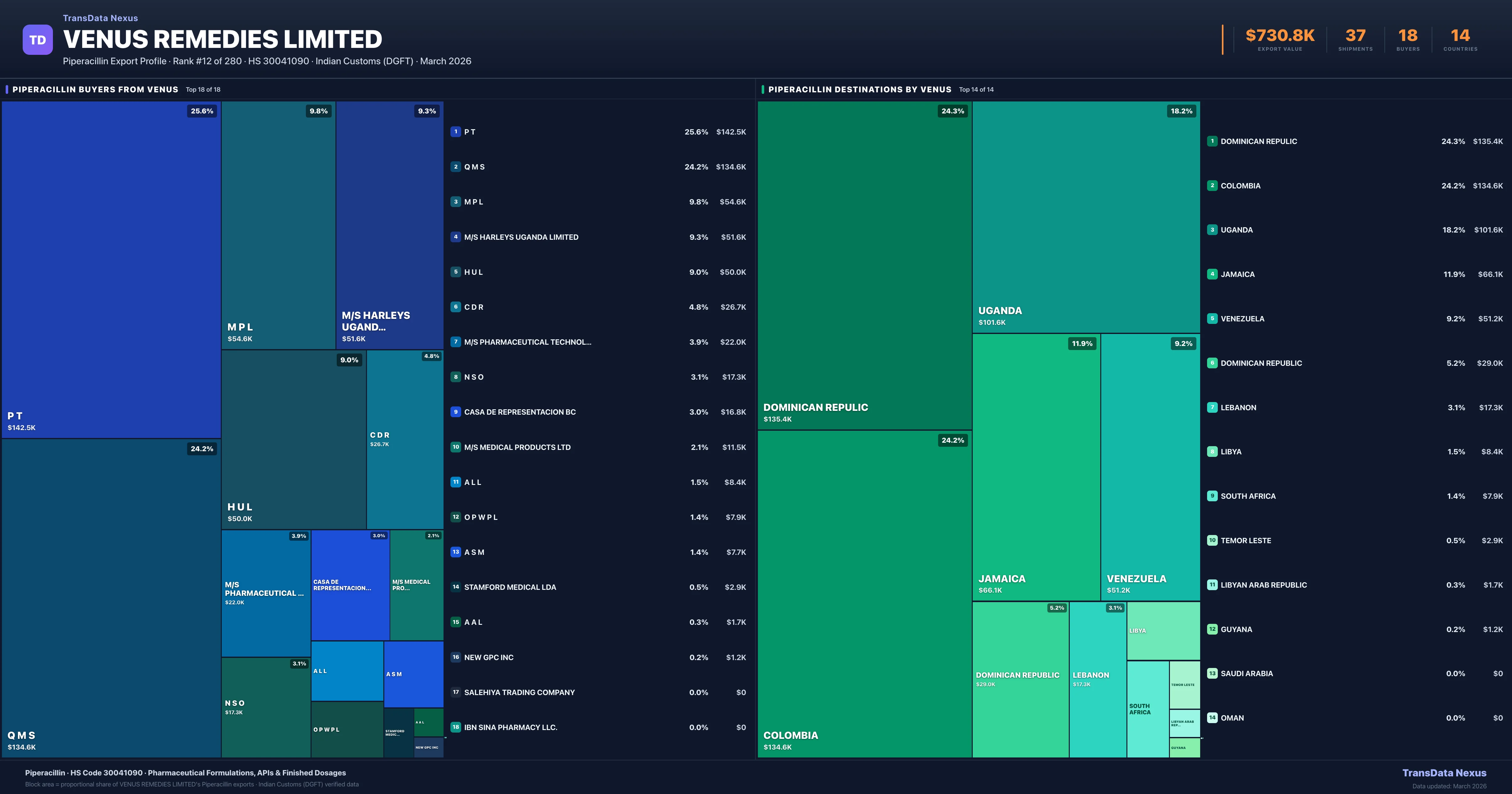 Venus Remedies Limited supplies Piperacillin to 18 buyers globally. The largest buyer is P T (DOMINICAN REPULIC), followed by Q M S (COLOMBIA) and M P L (JAMAICA). These buyers represent pharmaceutical distributors, hospital groups, and government procurement agencies in their respective markets.