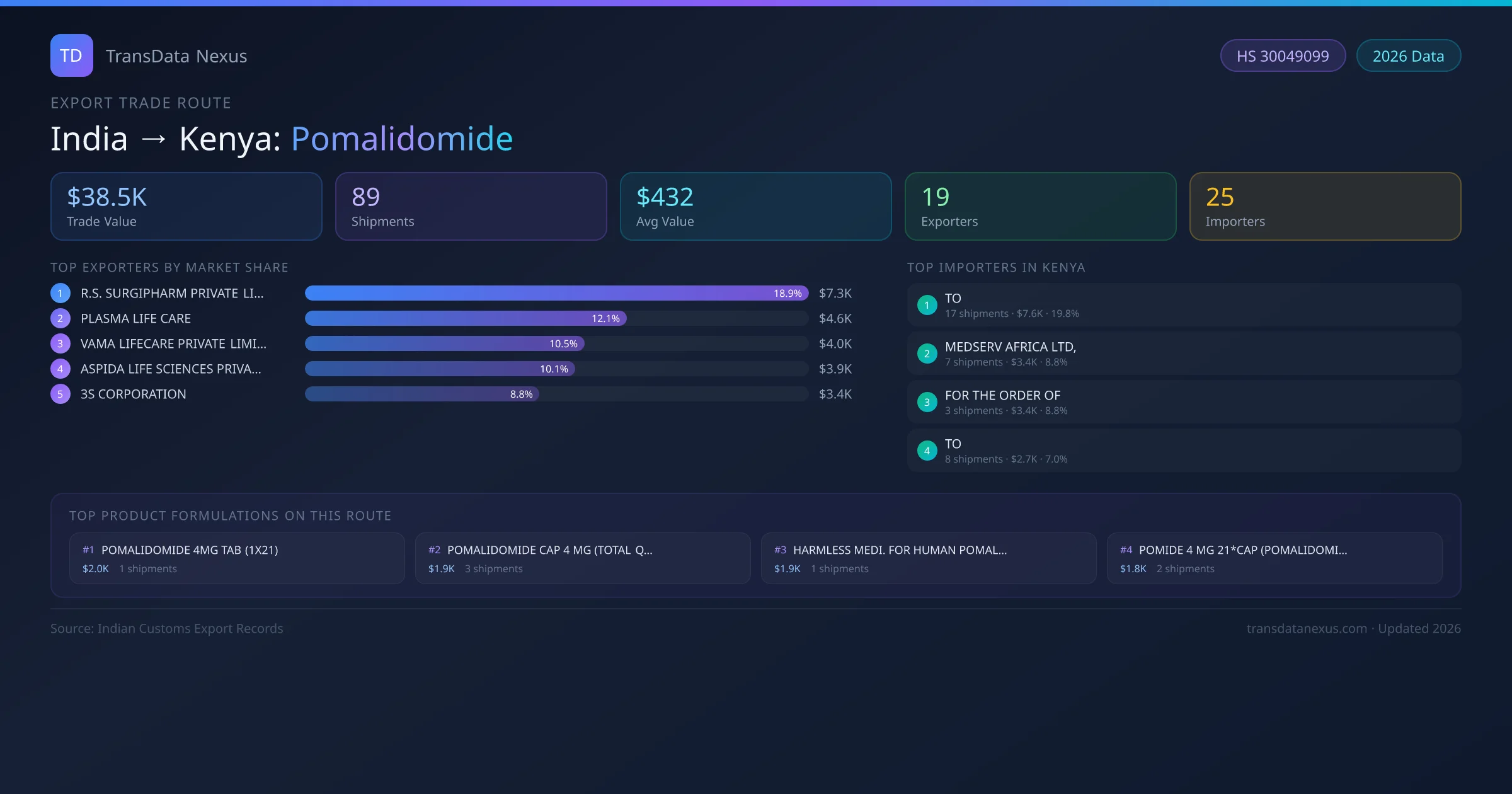 - 1.Route Identification: India to Kenya export trade corridor identified from Indian Customs (DGFT) records for Pomalidomide.