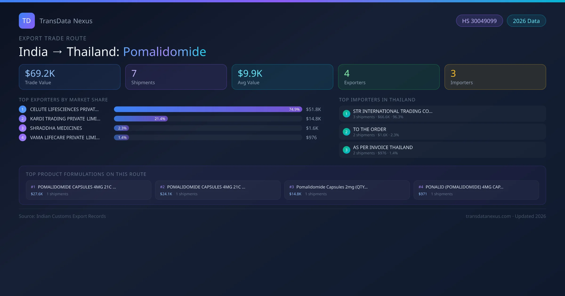 - 1.Route Identification: India to Thailand export trade corridor identified from Indian Customs (DGFT) records for Pomalidomide.