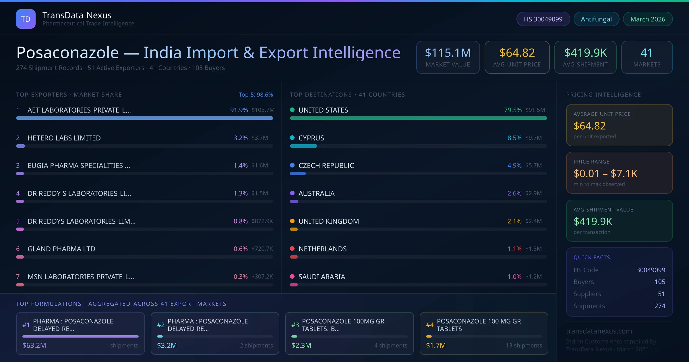 Between 2022 and 2026, India exported $115.1M worth of posaconazole across 274 verified shipments to 41 countries — covering 21% of world markets in the Advanced Antifungals segment. The largest destination is UNITED STATES (79.5%). AET LABORATORIES PRIVATE LIMITED leads with a 91.9% share. All figures are drawn from Indian Customs (DGFT) shipping bill records spanning four years of trade activity.