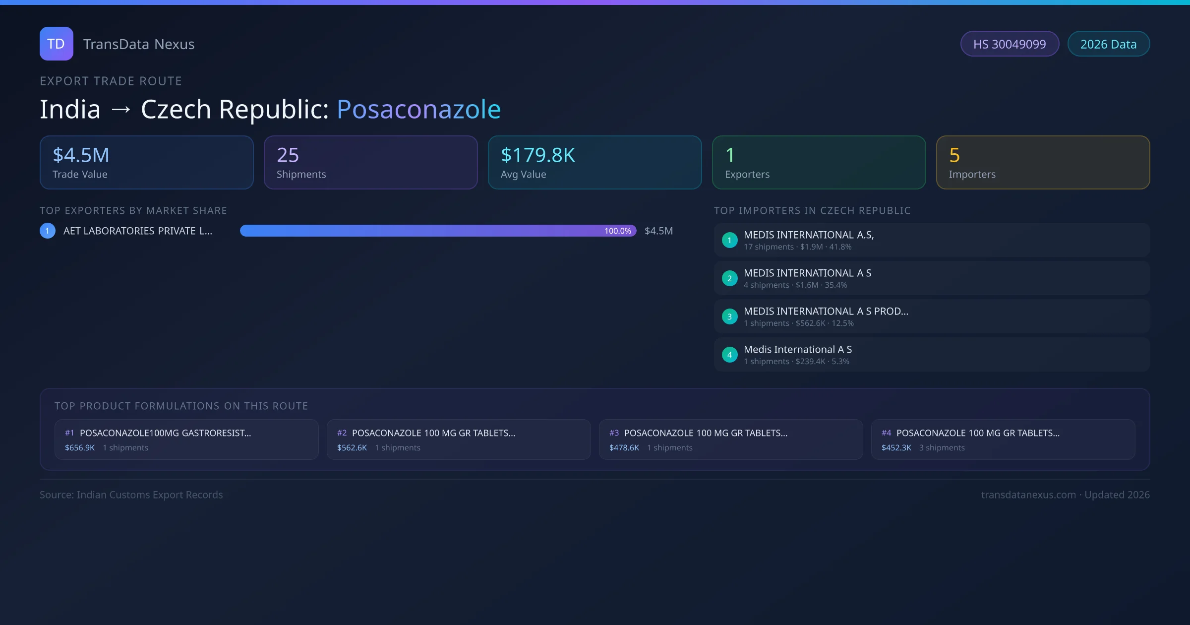 India has recorded 25 verified shipments of Posaconazole exported to Czech Republic, representing a combined trade value of $4.5M USD. This corridor is served by 1 active Indian exporters, with an average shipment value of $179.8K USD. The leading Indian exporter is AET LABORATORIES PRIVATE LIMITED, which accounts for 100% of total export value with 25 shipments worth $4.5M USD. On the buying side, MEDIS INTERNATIONAL A.S, is the largest importer in Czech Republic with $1.9M USD in purchases. All data sourced from Indian Customs (DGFT) shipping bill records. Values reported in FOB USD.