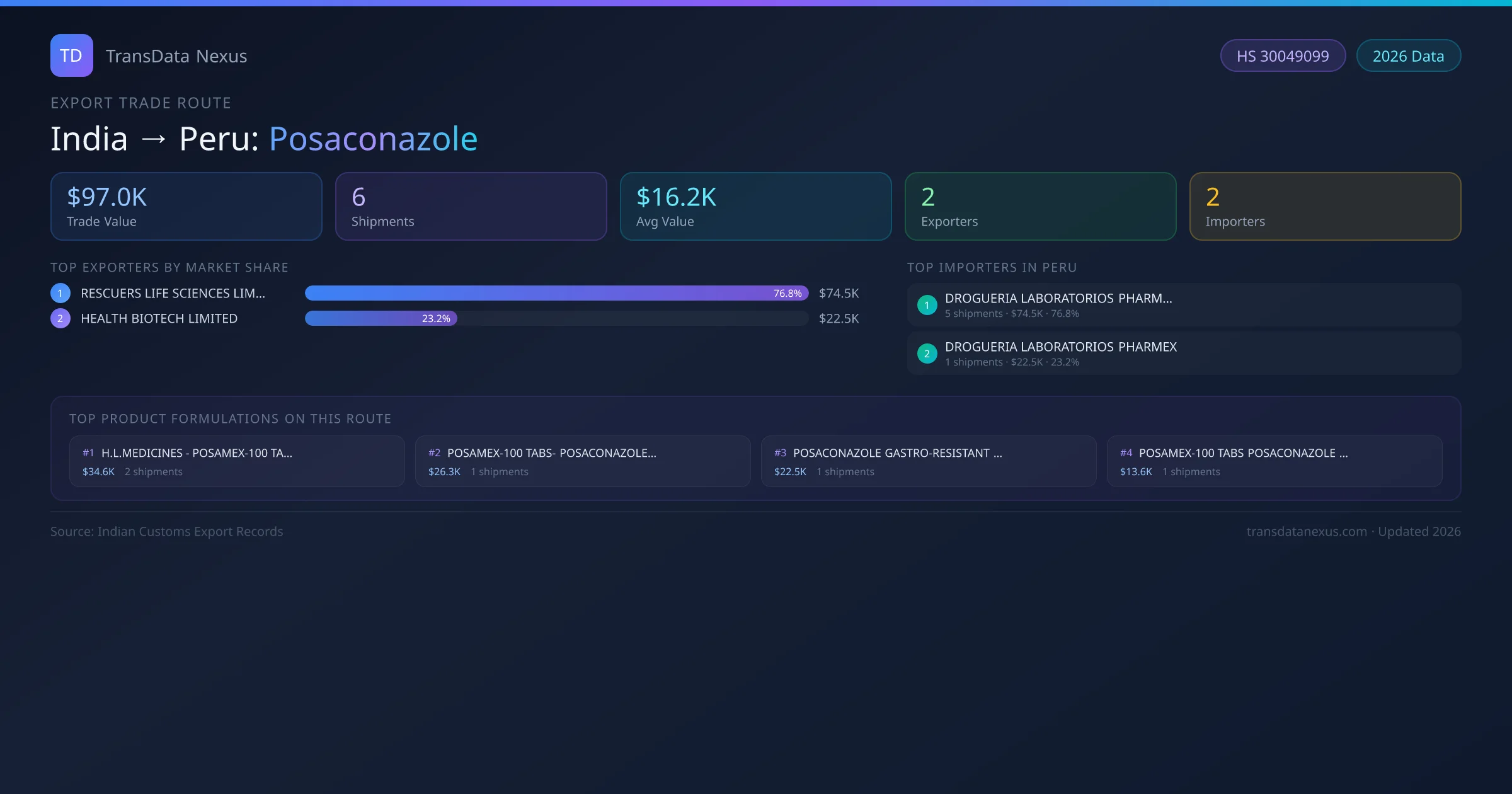 - 1.Route Identification: India to Peru export trade corridor identified from Indian Customs (DGFT) records for Posaconazole.