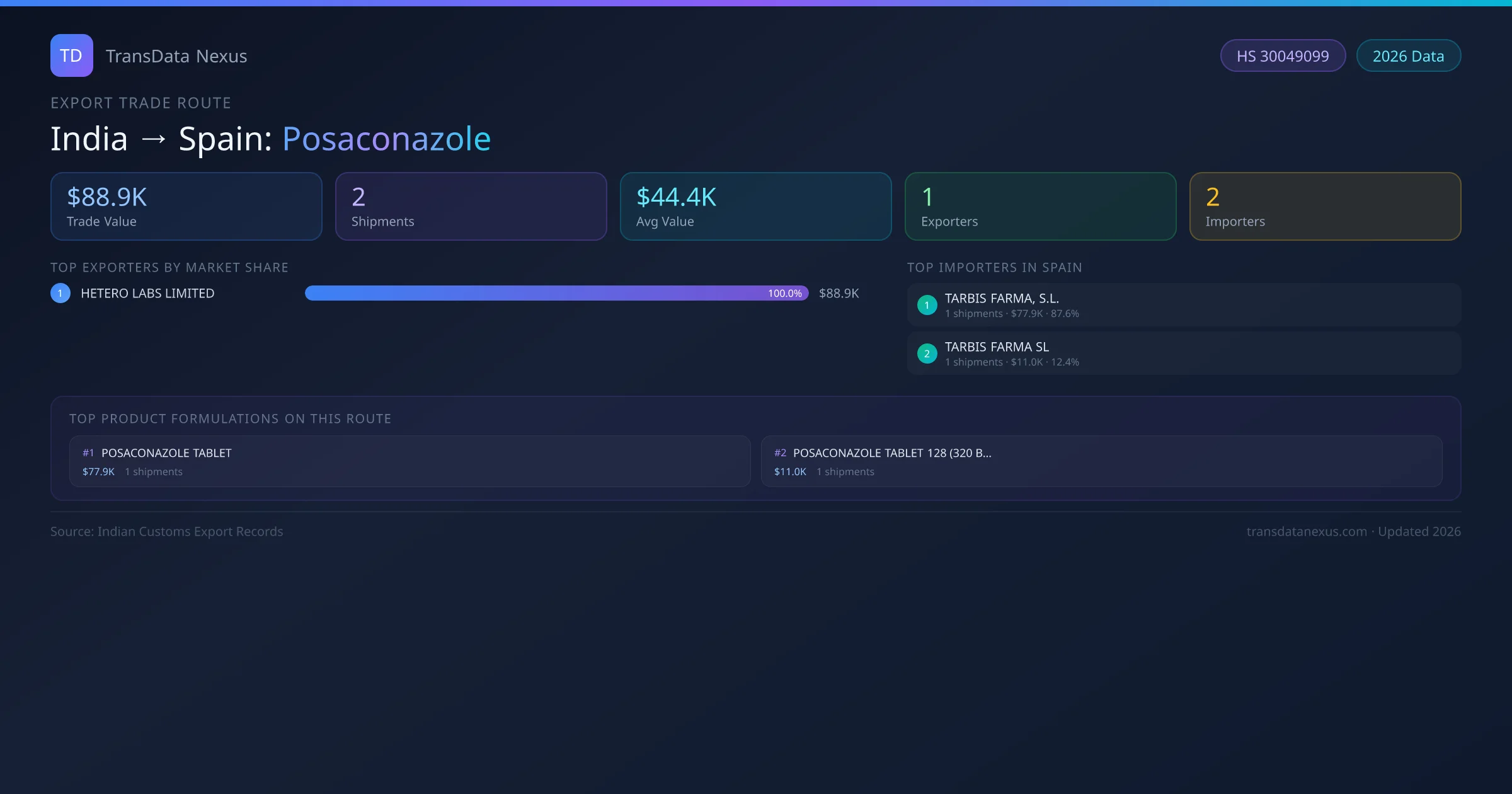 India has recorded 2 verified shipments of Posaconazole exported to Spain, representing a combined trade value of $88.9K USD. This corridor is served by 1 active Indian exporters, with an average shipment value of $44.4K USD. The leading Indian exporter is HETERO LABS LIMITED, which accounts for 100% of total export value with 2 shipments worth $88.9K USD. On the buying side, TARBIS FARMA, S.L. is the largest importer in Spain with $77.9K USD in purchases. All data sourced from Indian Customs (DGFT) shipping bill records. Values reported in FOB USD.